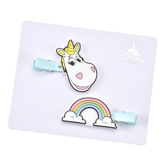 Haarspangen-Set mit Buttercup-Design, 2 Stück. Das Design umfasst Charaktergesichter und Regenbogen-Die-Cut-Motive auf hellblauen Clips. Ein...