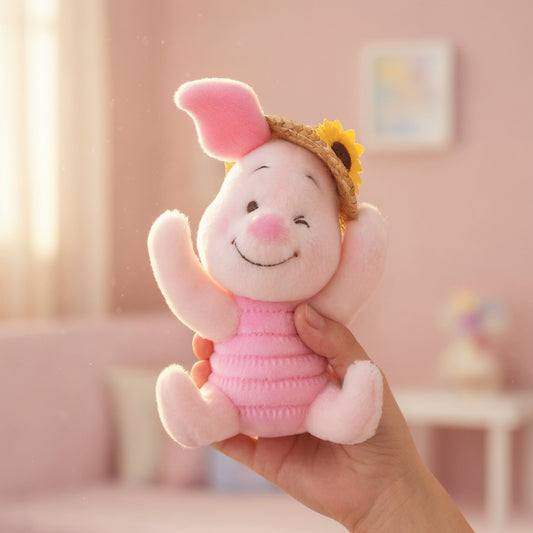 Die "Strohhut"-Serie ist voller Sommerstimmung. Hier ist ein Plüsch von Piglet. Piglet trägt einen Strohhut....
