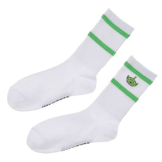 Weiße Socken mit gesticktem Little Green Men / Alien. Traditionell gestreifte Rippsocken. Das gestickte Charaktergesicht...