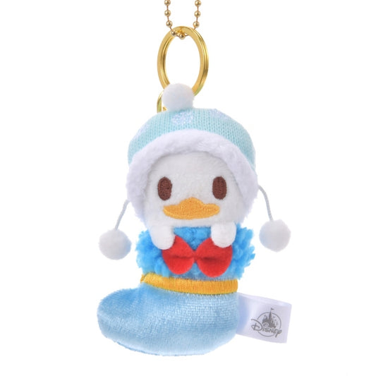 Donald Weihnachtsdesign. Handflächengroßer Plüsch-Schlüsselanhänger. Donald schaut aus einer Socke im vertrauten Kostüm hervor, ein sehr...