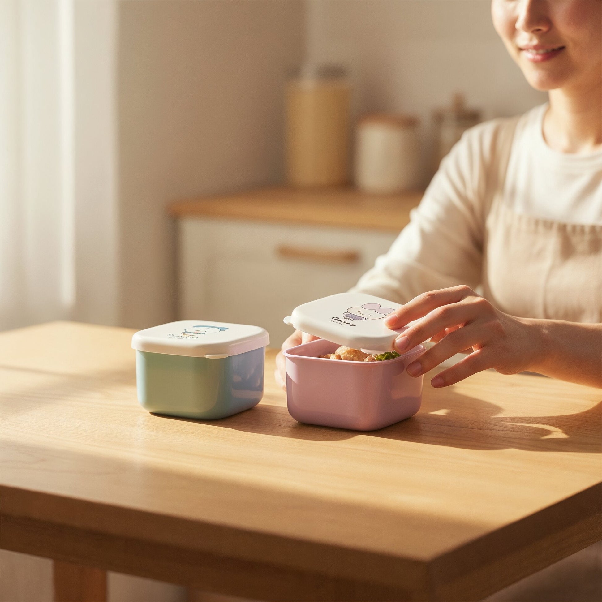 Set of 2 cute sticker containers. Ideal for storing desserts like fruit for lunch or storing small items. Microwave safe when the lid is removed!