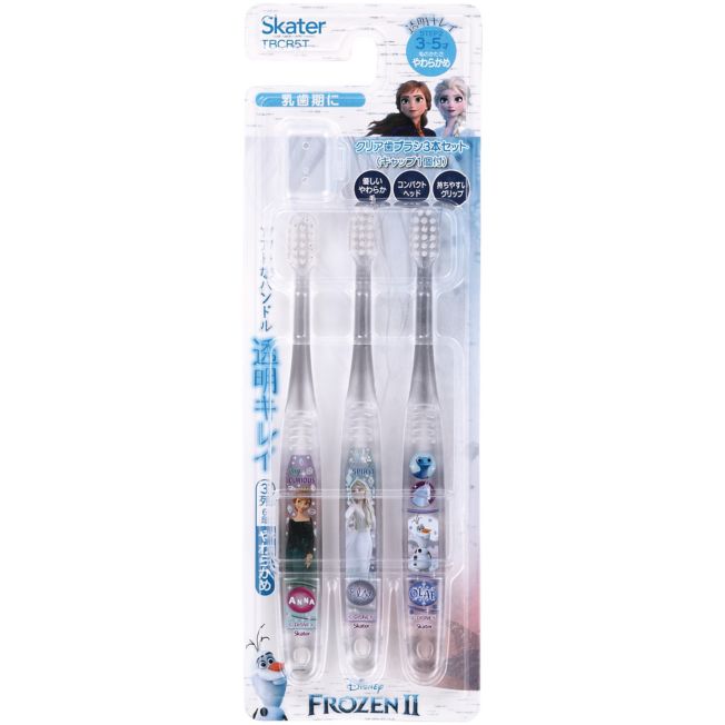 Set of 3 toothbrushes for children ages 3 to 5. Convenient for stocking up. ♪ The transparent, clear body is cute and stylish! ・ Gentle, soft bristles ・ Compact head that's easy to clean ・ Easy-to-hold handle ・ With cap for easy transport to school or daycare (1 piece)