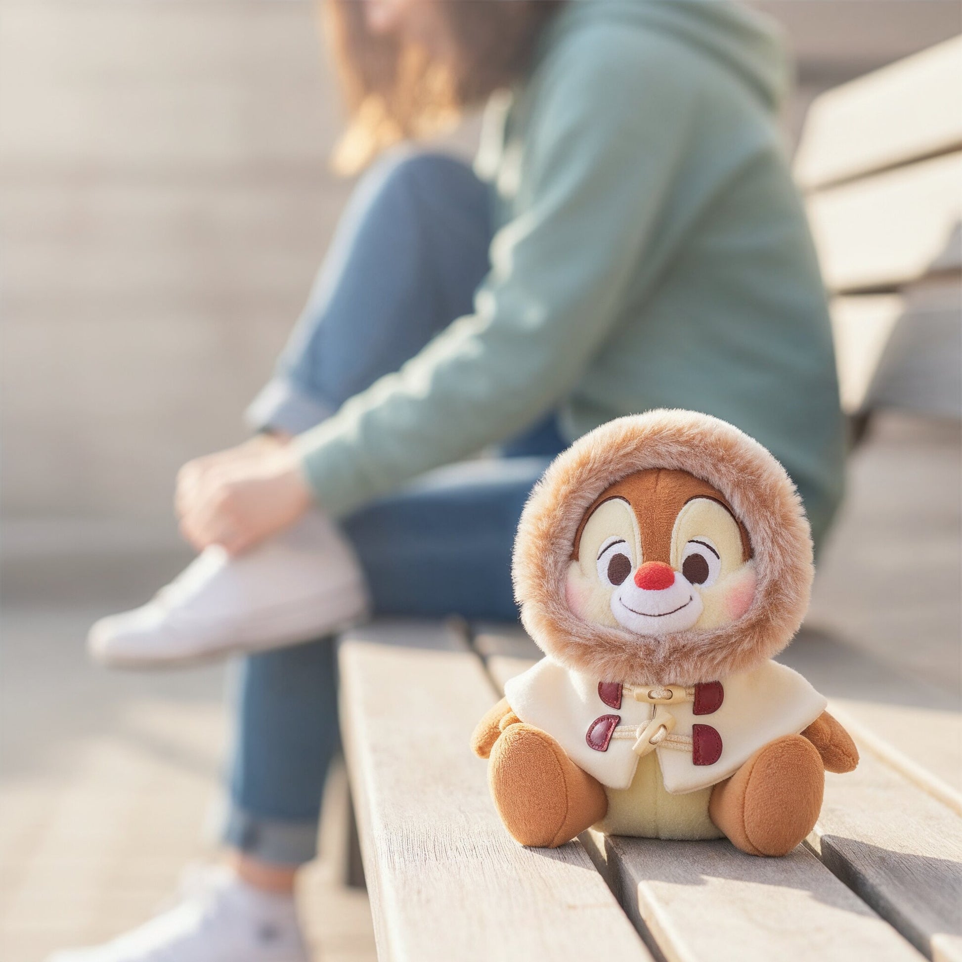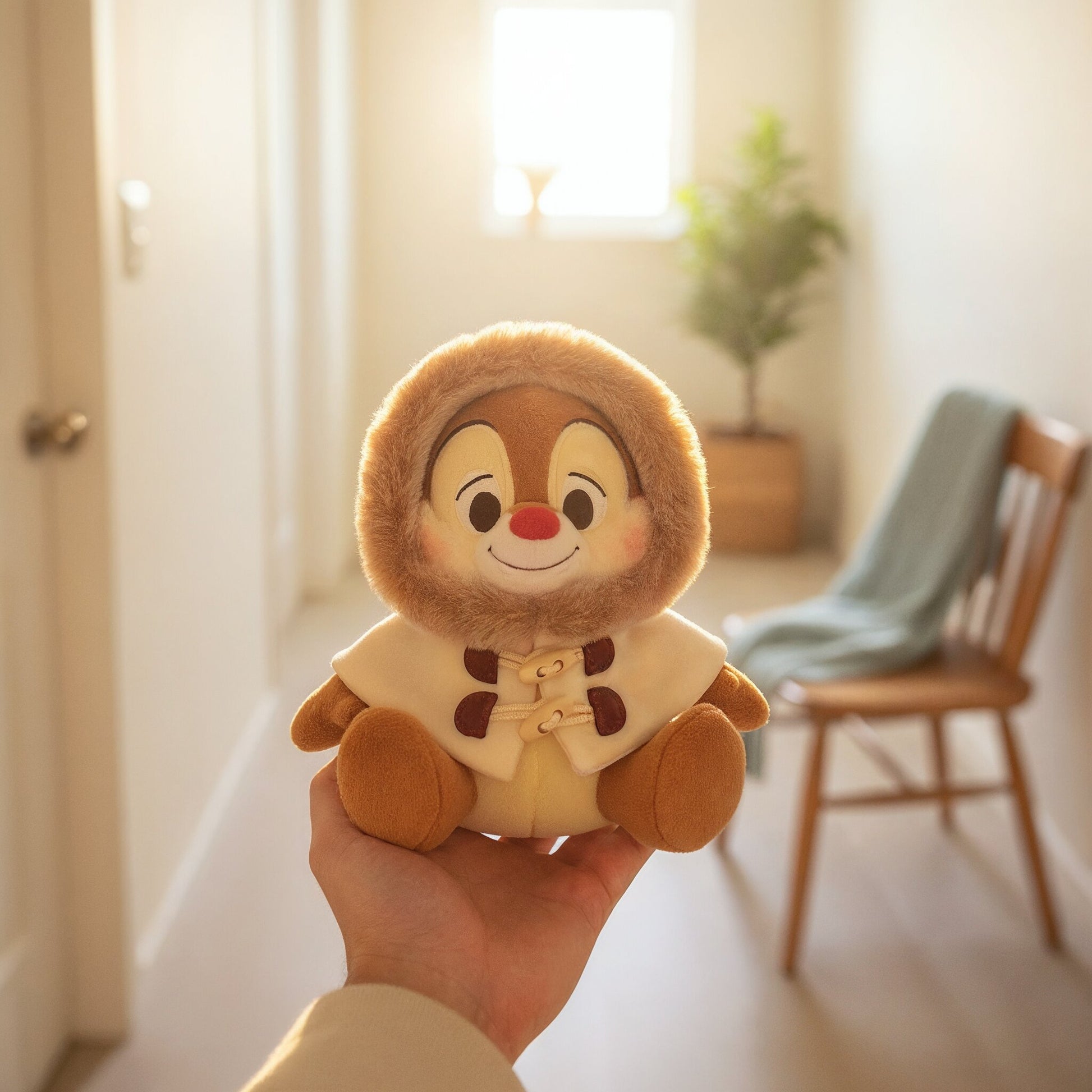 The "DUFFEL COLLECTION" series of plush toys that wear warm outerwear. Plush toy of Dale. Dale that goes well with a solid color chic cape coat. The hood is decorated with faux fur, which also makes the viewer feel warm. With toggle buttons and a lined coat in authentic style. The material is also firm. Placing it in the room will instantly create a seasonal atmosphere, so place it in a place of your choice and enjoy it