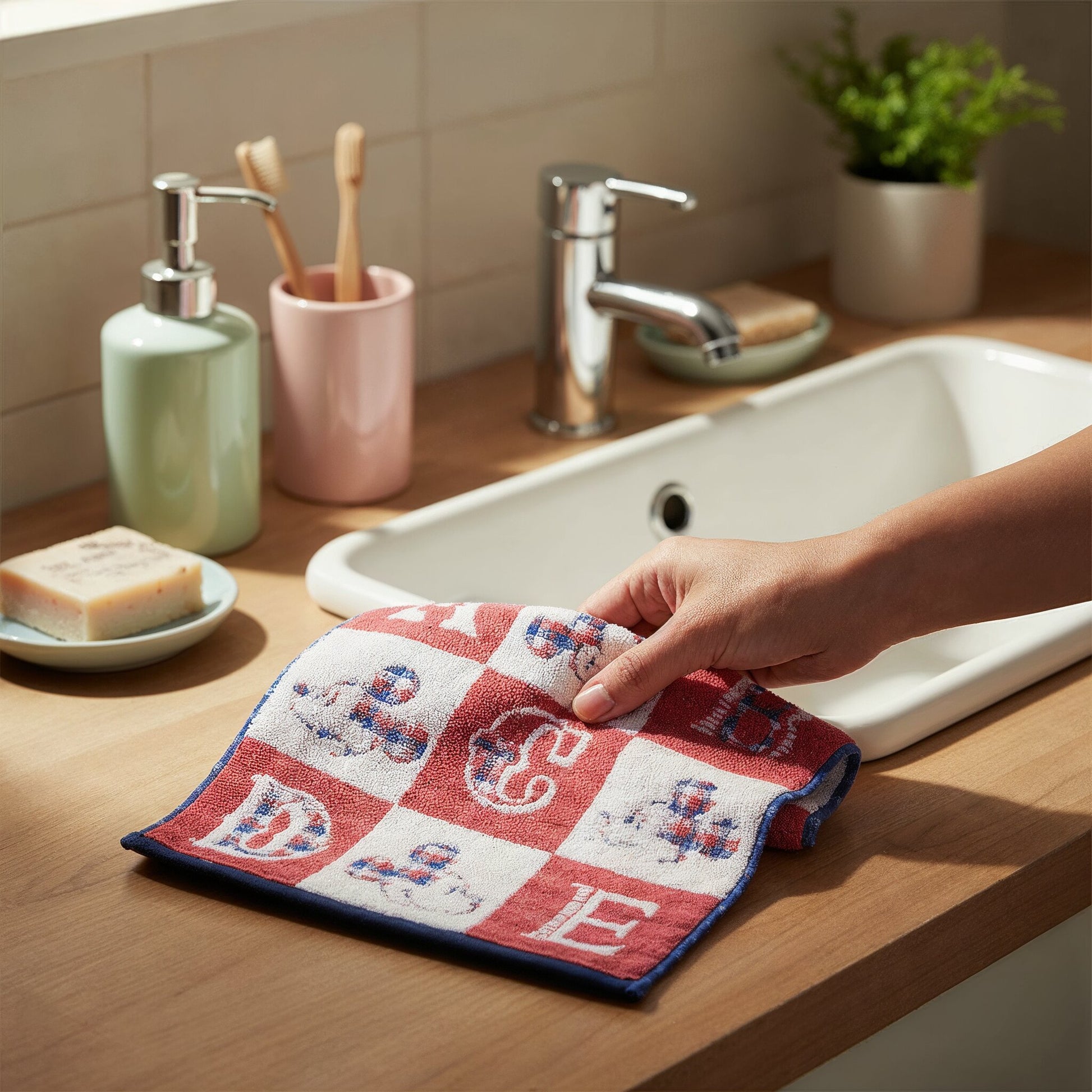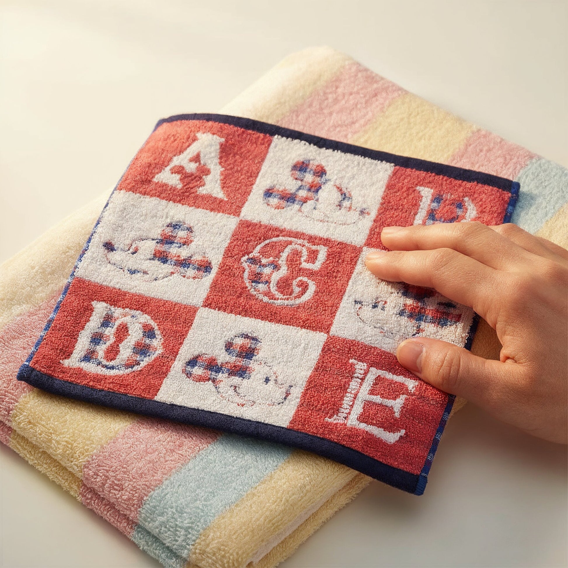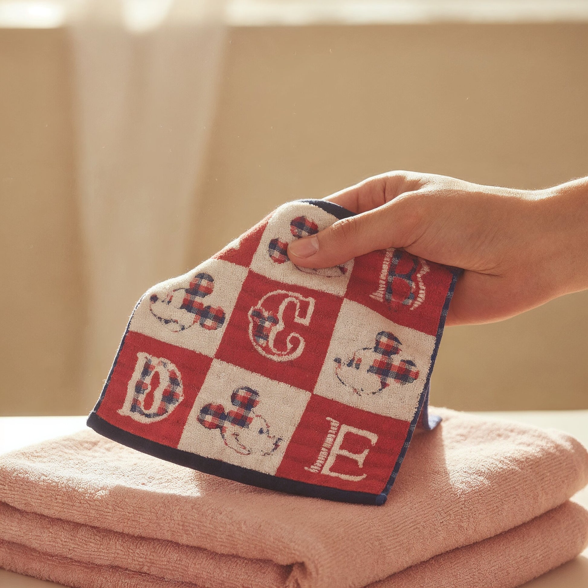 Design of alphabets and various facial expressions of Mickey in block shape ♪ A comfortable pile jacquard towel.