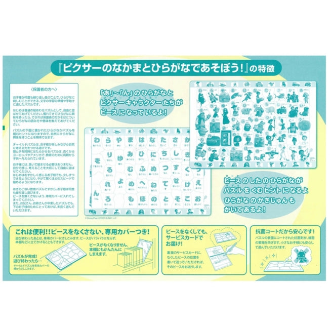 This puzzle is the king of educational toys! "Children's puzzle" promotes your child's intelligence and rich heart! While they have fun, they develop intuition for shapes, color sensitivity, dexterity and more. It is a puzzle with different characters from Pixar films such as Woody, Buzz and McQueen. Since the hiragana letters on the pieces are also written underneath, looking at these letters can be a clue to puzzles while also helping in learning hiragana. Age group: from 3 years