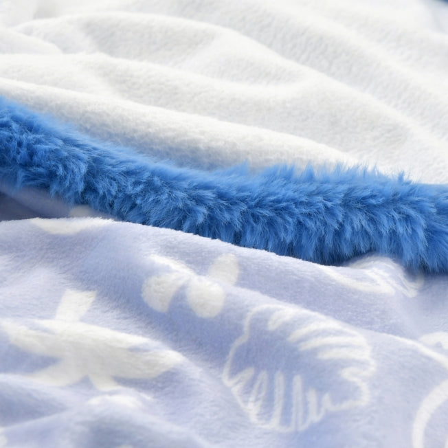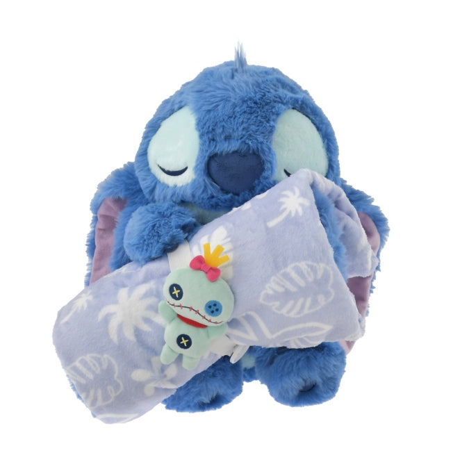 Cuddly blanket with soft toy Stitch. The cozy blanket in soft colors shows Stitch snuggling up close to the blanket and sleeping peacefully. The blanket also has a loop with a clip♪ The blanket has a pattern with palm trees and monstera leaves on one side and the other side is solid color. When you're not using it, you can simply roll it up and give it to the character for cute and compact storage. A warm accessory that will also become an accent in your room.