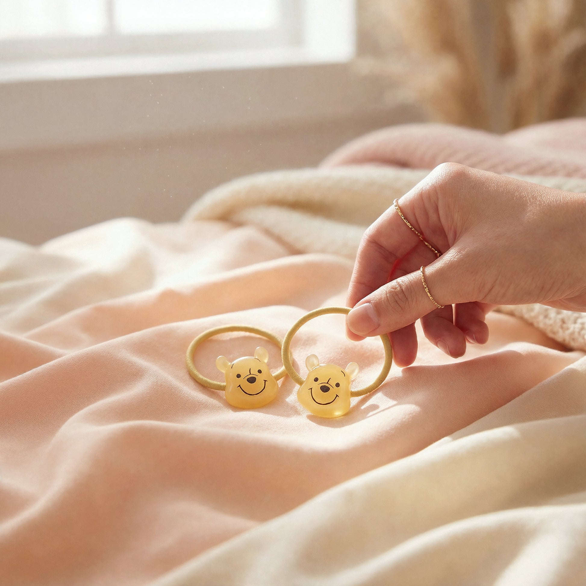 The set of 2 children's hair ties with the Winnie the Pooh motif is now available. The design is cut out on the character's face. The fluffy, shiny texture matches the character's cuteness perfectly. An accessory that allows you to style your hair quickly and fashionably by simply tying the hair. Ideal as a reward for children or as a small gift.