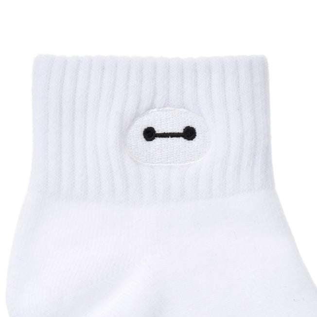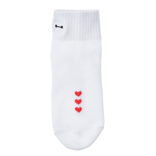 Kurze Socken im Design von Baymax. Die Socken haben die gleiche weiße Basis wie der Körper von Baymax. Das Bündchen ist mit dem Charaktergesicht bestickt und auf dem Spann sind Herzen angeordnet. Die Balance zwischen der einfachen Alltagstauglichkeit und der subtilen Präsenz des Charakters macht diese Socken zu einem erfreulichen Paar.