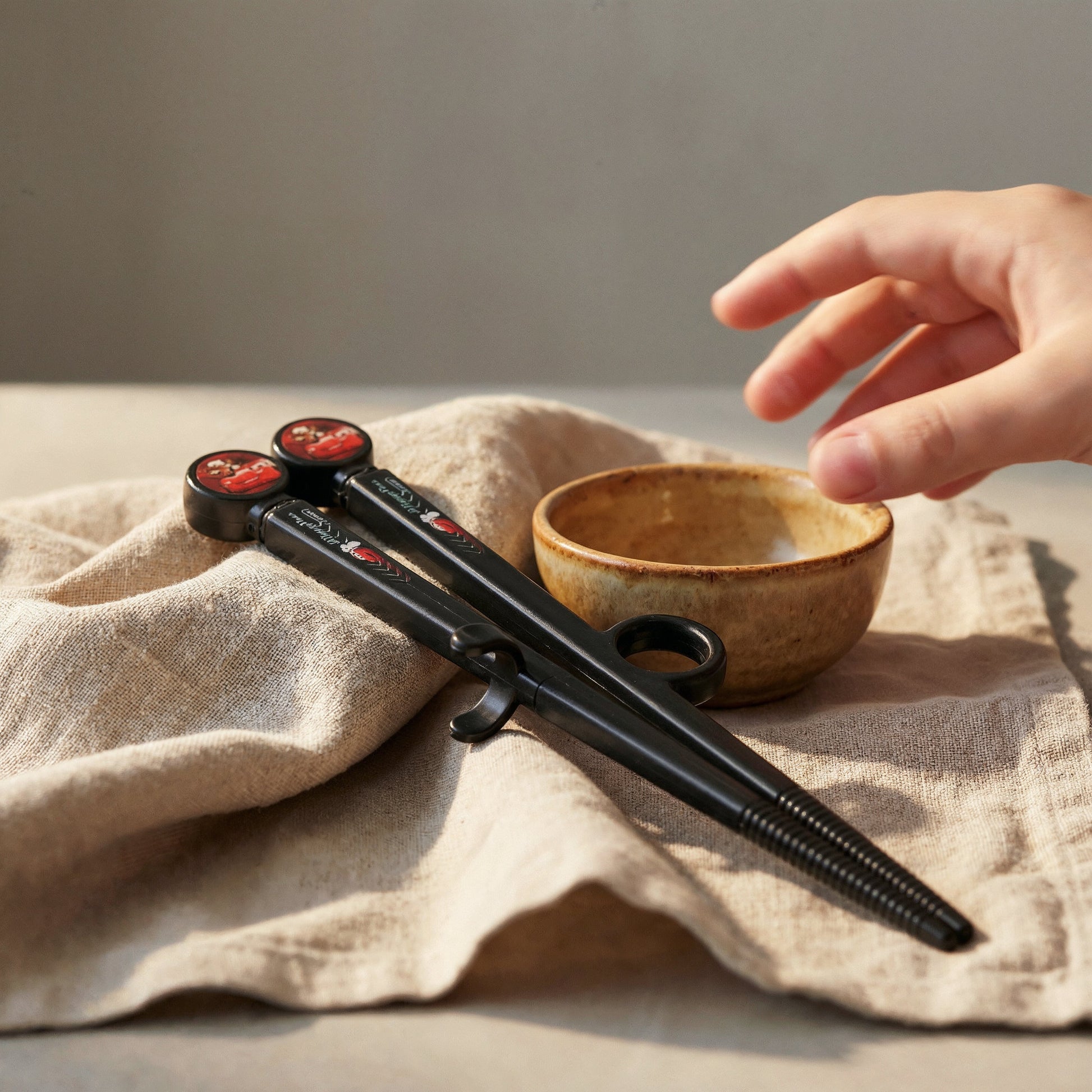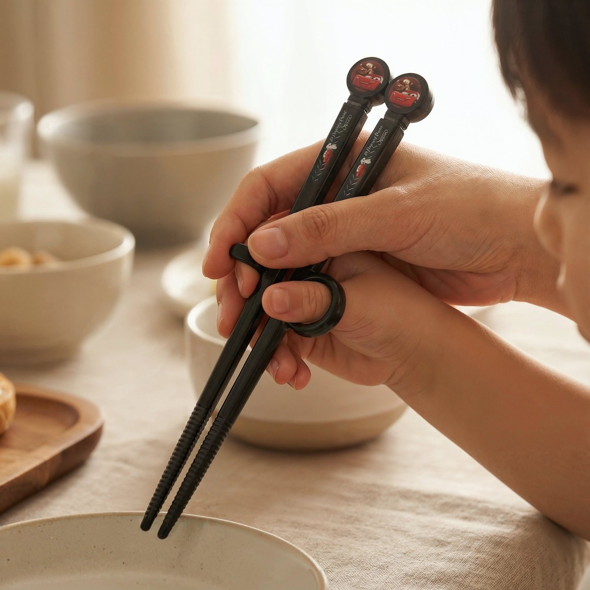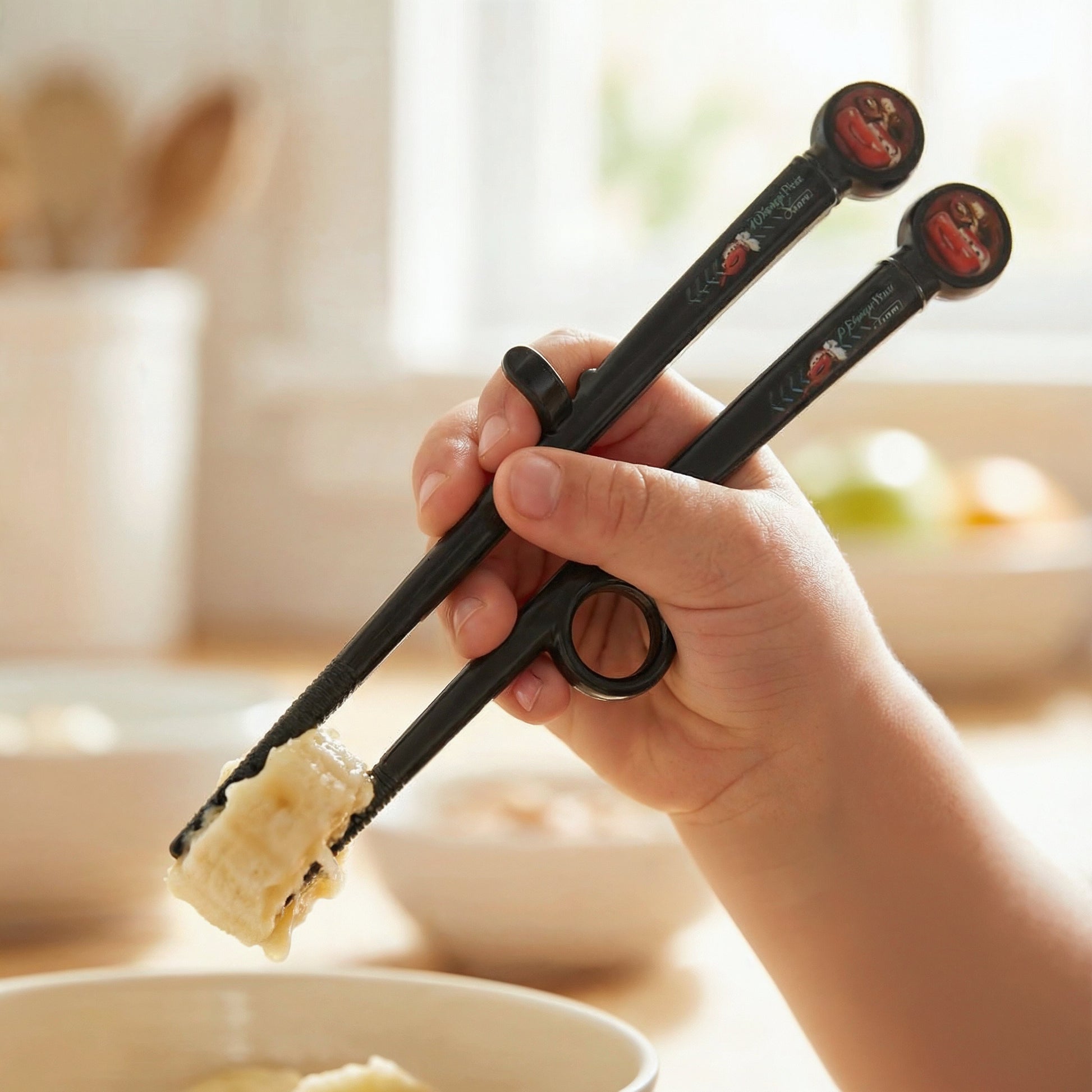 Wenn Sie Ihren Finger richtig auf die Stäbchen legen und sie verwenden, werden Sie mit der Zeit lernen, wie man die Stäbchen richtig benutzt. Mit dem niedlichen Maskottchen macht das Üben mit den Stäbchen sicher Spaß!