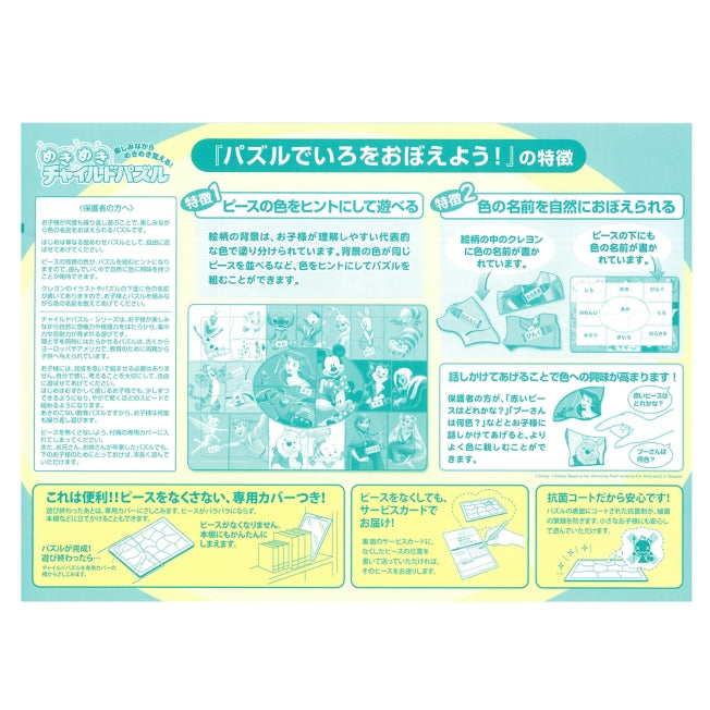 Dieses Puzzle ist der König der Bildungsspielzeuge! "Kinderpuzzle" fördert die Intelligenz und das reiche Herz Ihres Kindes! Während sie Spaß haben, entwickeln sie intuitive Fähigkeiten für Formen, Farbwahrnehmung und Geschicklichkeit. Es zeigt verschiedene Disney-Charaktere wie Mickey, Pooh, und Prinzessinnen. Der Hintergrund ist in Farben gestaltet, die für Kinder leicht zu erkennen sind, was das Puzzeln erleichtert. Die Farbnamen sind auf den Teilen geschrieben, was dazu beiträgt, dass Kinder die Farben lernen. Alter: ab 3 Jahren