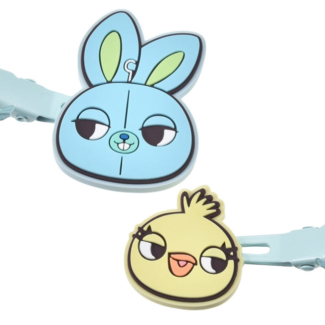 Eine Kombination aus hellblauen Clips und Charakteren aus "Toy Story 4". Hier sind zwei Haarspangen von Ducky & Bunny. Ein praktisches Accessoire, um die Ponyfrisur beim Schminken oder Frisieren sicher zu fixieren. Mit diesen Haarspangen können Sie sich keine Sorgen mehr machen, dass Spuren auf Ihrem Pony zurückbleiben. Perfekt für die Arbeit zu Hause, beim Lernen oder in der Entspannungszeit.