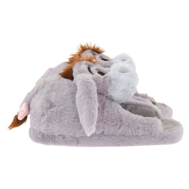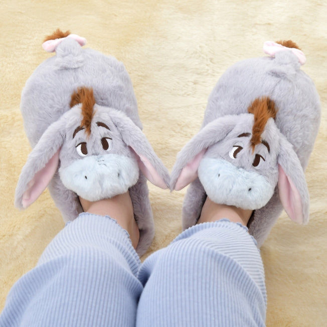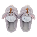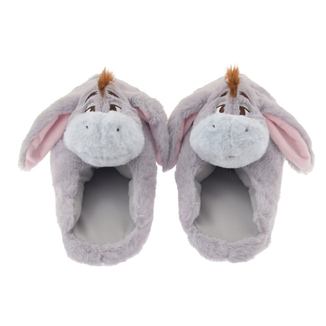 Hausschuhe im Design von I-Aah. Die beliebte Esel-Plüschfigur aus "Winnie the Pooh" wird in flauschigen Hausschuhen nachgebildet. Das Gesicht, das aussieht, als würde es sich an die Füße schmiegen und "Hey, hey" sagen, kitzelt das Herz der Fans. Beachten Sie auch die langen Ohren und den Schwanz. Ein charaktervolles Accessoire. Ein Muss für entspannte Zeiten zu Hause.
