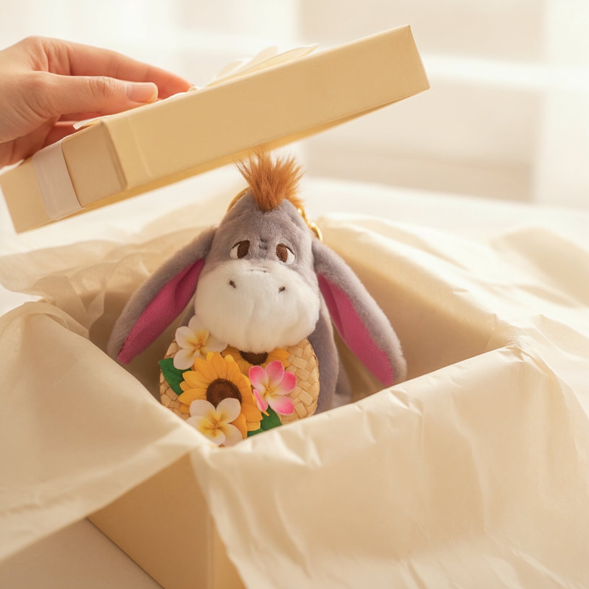 Die "Strohhut"-Serie ist voller Sommerstimmung. Hier ist ein Eeyore Plüsch-Schlüsselanhänger. Eeyore hält einen großen Strohhut, der mit Sonnenblumen- und Plumeria-Blumen verziert ist, als ob er einen Sommerstrauß trägt. Achten Sie auch auf das niedliche Gesicht des Charakters, das gut zu dem lebendigen und frischen Hut passt. Mit einem Karabinerhaken, der leicht an Ihrer Tasche oder anderen Gegenständen befestigt werden kann. Ein perfekter Begleiter für Sommerausflüge.