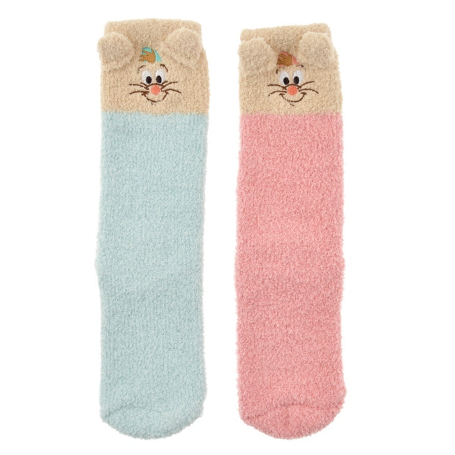 Hier sind flauschige, asymmetrische Socken mit einem Design von Jack und Gas. Das Motiv basiert auf den Mäusecharakteren aus "Cinderella" und ist einzigartig und niedlich. Das Charaktergesicht ist mit Stickereien und Nähten voller Spielfreude gestaltet, und auch die Unterseite der Socken ist einen Blick wert. Es gibt sogar eine rutschfeste Käse-Motiv-Beschichtung ♪