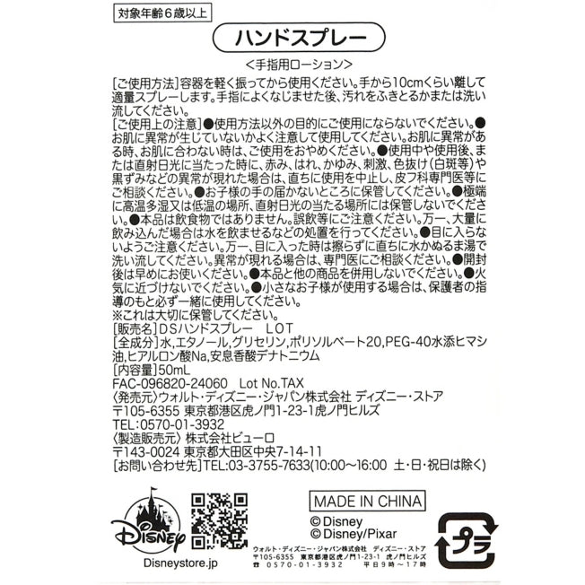 Feuchtigkeitsspendendes Hand-Spray. Es ist mit einem "Toy Story"-Design mit Lotso als Hauptfigur erhältlich. Ein praktisches Hand-Spray für Situationen, in denen Sie Ihre Hände nicht waschen können, wenn Sie unterwegs sind. Schütteln Sie den Behälter leicht und sprühen Sie eine angemessene Menge etwa 10 cm von Ihren Händen entfernt. Nachdem Sie es gut in Ihre Hände eingearbeitet haben, wischen Sie den Schmutz ab oder spülen Sie ihn ab. Aufgrund des schlanken Designs passt es problemlos in eine kleine Tasche und ist ideal für Ausflüge. Es ist praktisch, es immer bei Spaziergängen, Outdoor-Aktivitäten, in öffentlichen Räumen usw. dabei zu haben.