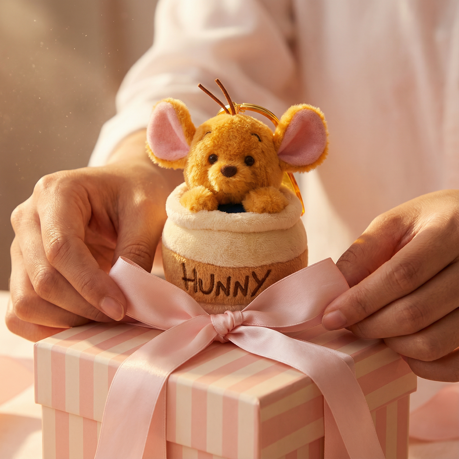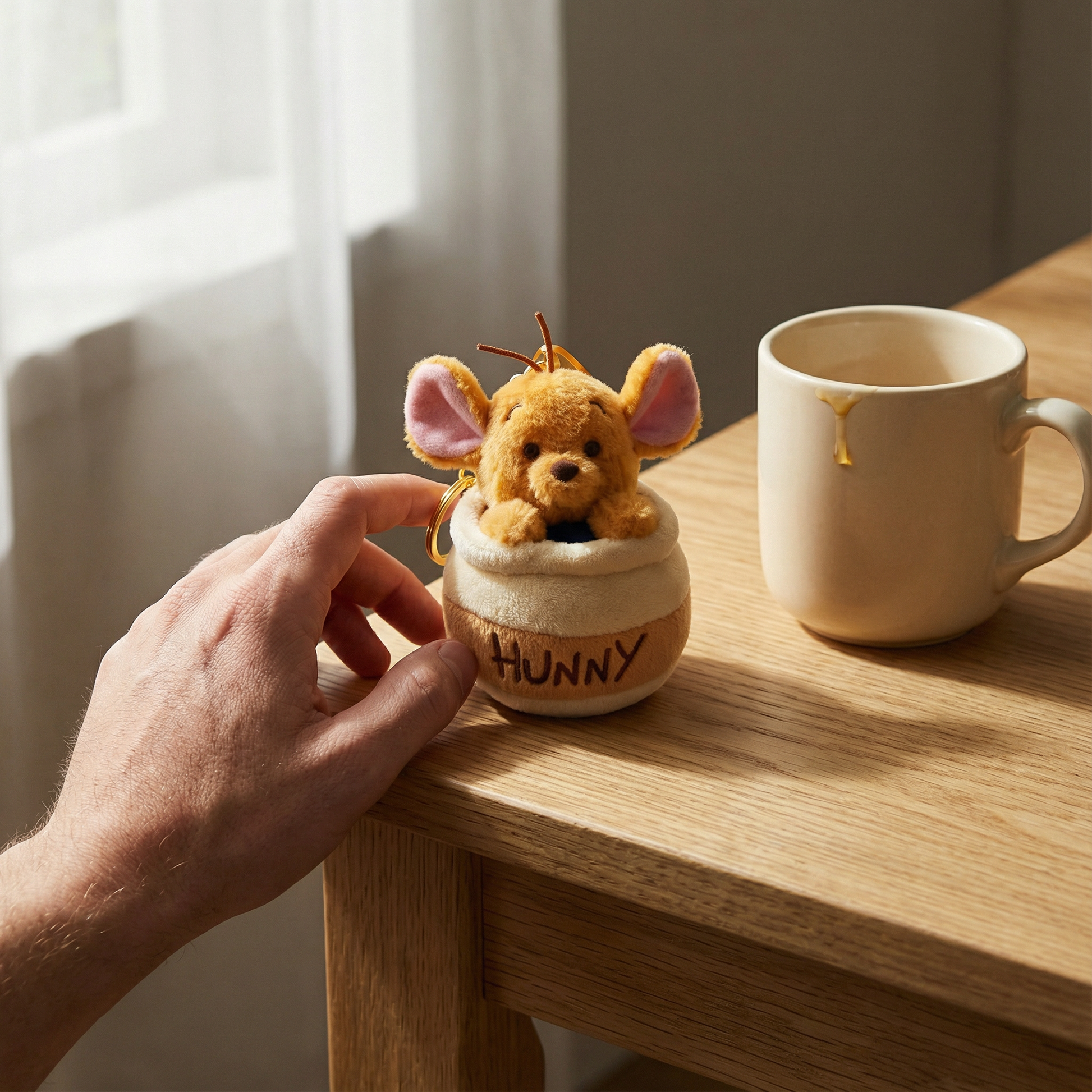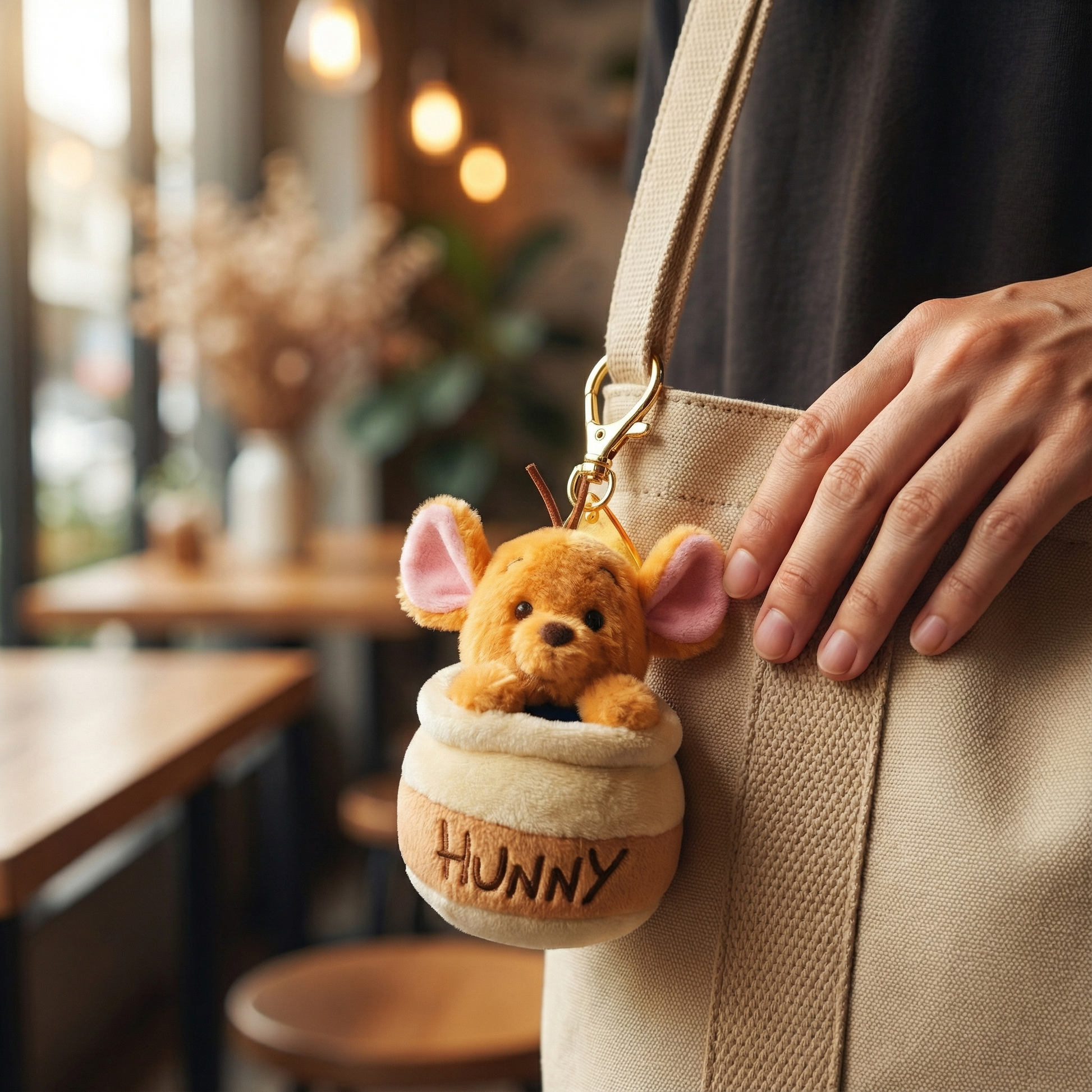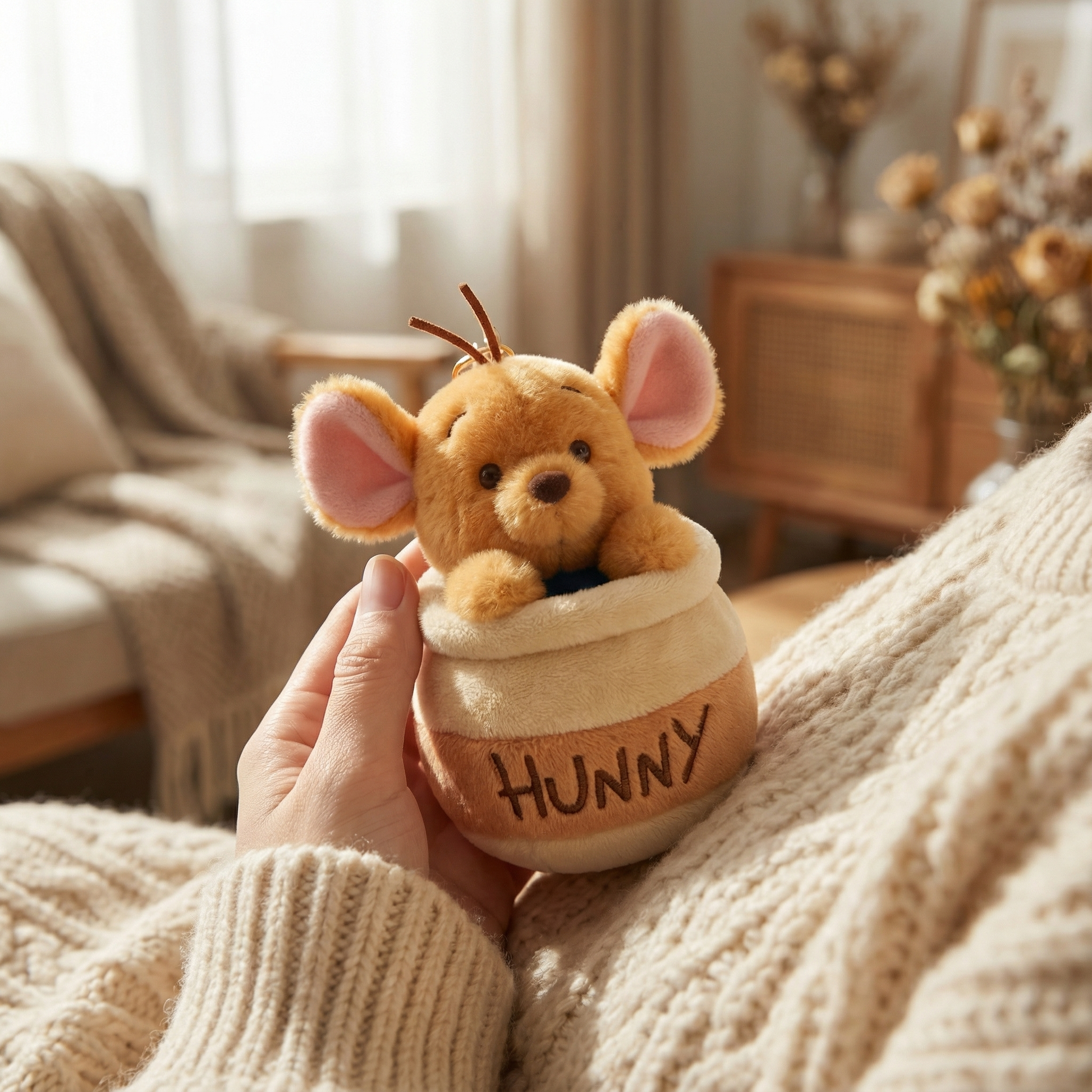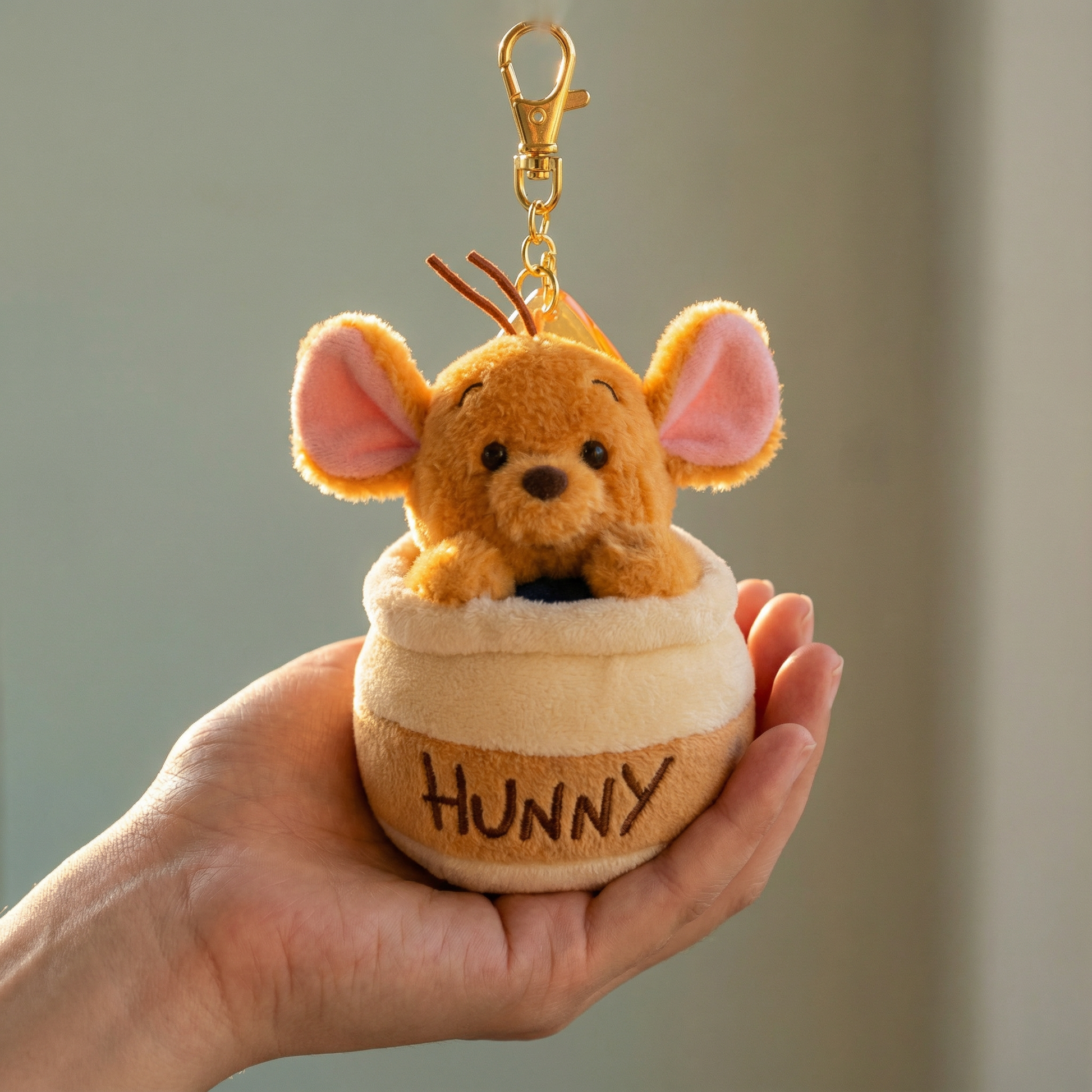 Entworfener Plüsch-Schlüsselanhänger in einem Honigtopf. Der Plüschschlüsselanhänger ist jetzt erhältlich. Der in den Honigtopf eingetauchte Pu. Das Bild, wie er aus dem großen Topf schaut, ist unwiderstehlich niedlich! Sie können auch den Körper von Pu aus dem runden Honigtopf herausholen. Die tropfenförmigen klaren Teile glänzen in honiggelber Farbe und haben eine glänzende Textur wie echter Honig. Befestigen Sie ihn an Ihrer Tasche und genießen Sie Ausflüge mit Pu!