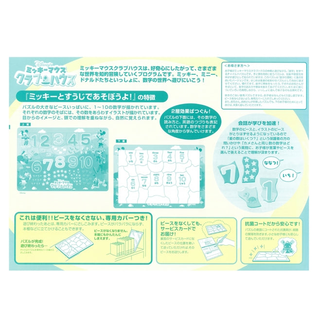 Puzzles sind der König der Bildungsspielzeuge! "Kinderpuzzle" fördert die Intelligenz und das reiche Herz Ihres Kindes! Während sie Spaß haben, werden intuitive Fähigkeiten für Formen, Farbwahrnehmung und Geschicklichkeit entwickelt. Mit den Bildern von Mickey und seinen Freunden macht das Spielen Spaß und Ihr Kind kann auf natürliche Weise mit Zahlen vertraut werden. Da die auf den Teilen abgebildeten Zahlen auch unter den Teilen geschrieben sind, wird das Betrachten dieser Zahlen zu einem Hinweis zum Puzzeln und es ist zu erwarten, dass Ihr Kind beim Spielen auch die Zahlen lernt. Altersgruppe: 3 Jahre und älter