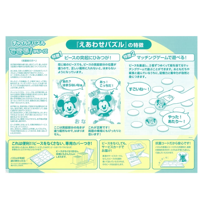 Puzzles sind die Könige der Bildungsspielzeuge! "Kinderpuzzle" fördert die Intelligenz und das reiche Herz Ihres Kindes! Mit den Teilen und der Puzzle-Unterlage können Sie auch andere Spiele als Puzzles spielen! Wenn Sie die herausgenommenen Teile mit der Vorderseite nach oben anordnen, können Sie auch ein Matching-Spiel spielen, bei dem Sie zwei Teile umdrehen und das gleiche Bild finden! Während Sie Spaß haben, entwickeln Sie Intuition für Formen, Farbsensibilität, Geschicklichkeit und vieles mehr. Empfohlenes Alter: 3 Jahre und älter.