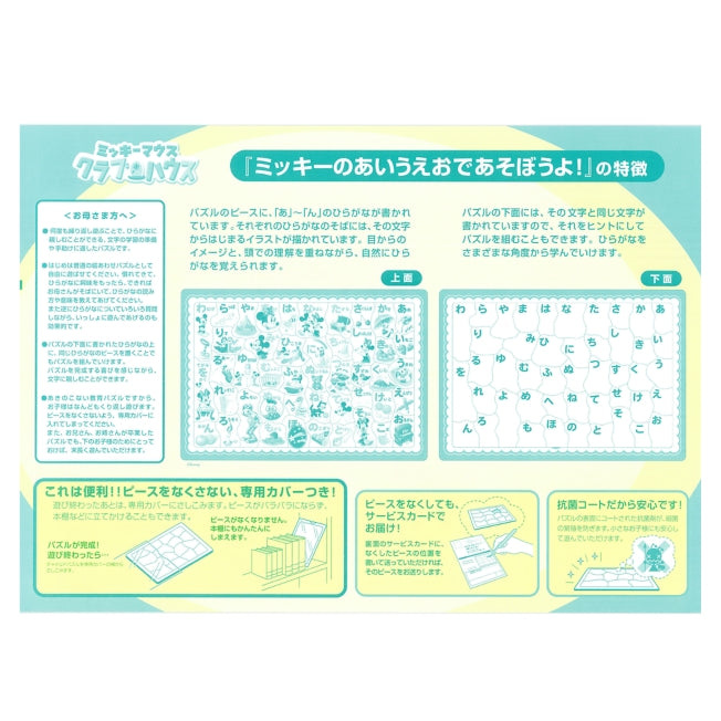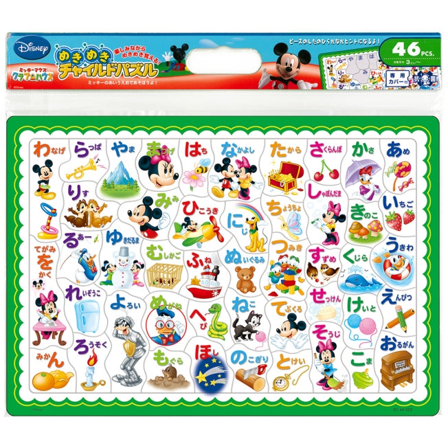 Puzzles sind die Könige der pädagogischen Spielzeuge! "Kinderpuzzle" fördert die Intelligenz und das reiche Herz Ihres Kindes! Während sie Spaß haben, entwickeln sie Intuition für Formen, Farbempfindlichkeit, Fingerfertigkeit und mehr. Mit den Bildern von Micky und seinen Freunden macht das Spielen Spaß und sie können auf natürliche Weise Hiragana lernen. Da die Hiragana auf den Teilen auch unter den Teilen geschrieben sind, kann das Betrachten dieser Buchstaben ein Hinweis zum Puzzeln sein, so dass Sie beim Spaß haben auch das Hiragana lernen können. Altersgruppe: ab 3 Jahren
