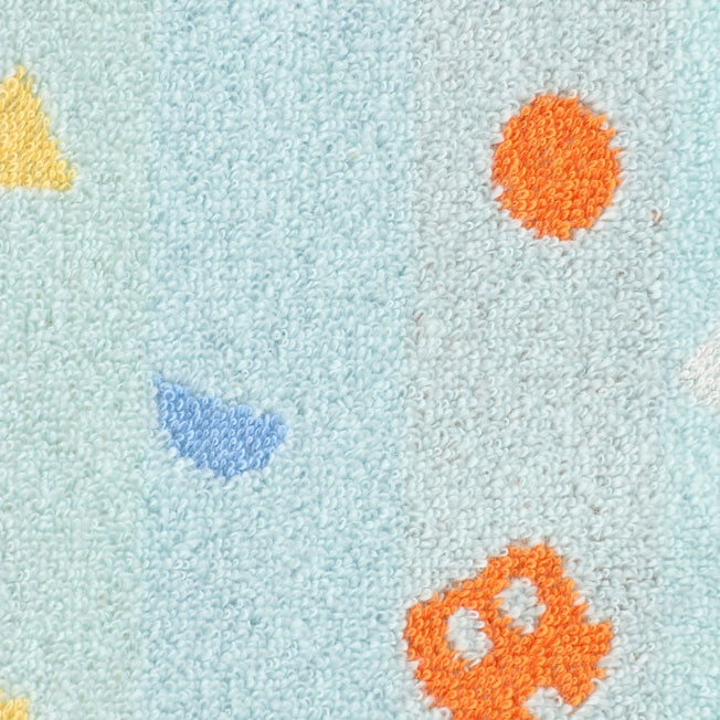 Ein Jacquard-Handtuch mit geometrischen Motiven, die an Spielzeug-Bausteine erinnern und mit den Motiven verschiedener Charaktere verziert sind. Ein besonderes Merkmal sind die unterschiedlichen Designs an den Saumteilen für jeden Charakter. Aufgrund des weichen, flauschigen Garns eignet es sich auch gut als Geschenk zur Geburt oder zur Feier.