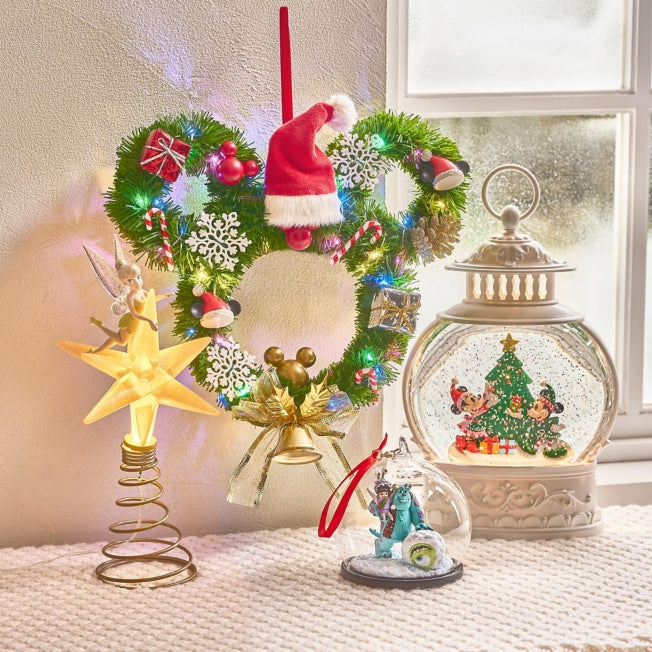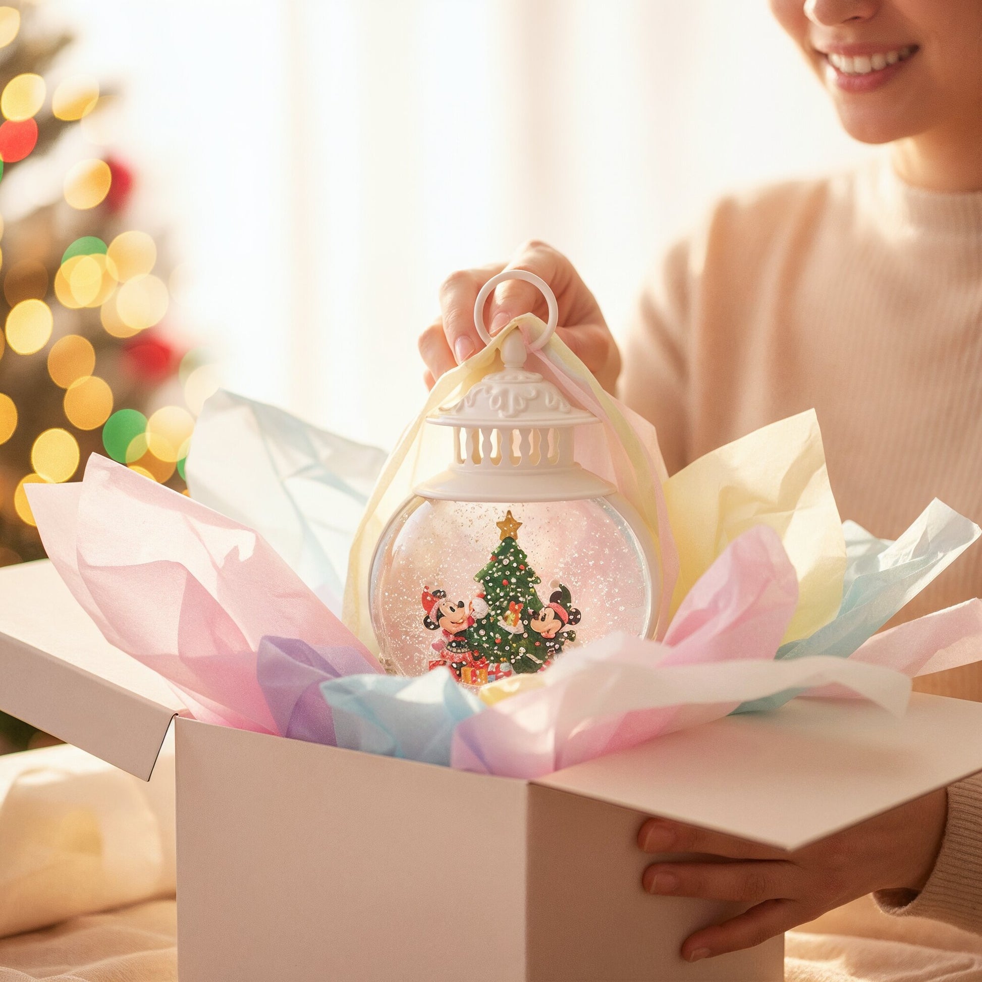 Musikspielender, leuchtender Schneekugel. Mit dem Laternendesign von Mickey & Minnie. Im Inneren der Kuppel sind Mickey und Minnie in festlicher Weihnachtskleidung zu sehen. Ein großer Weihnachtsbaum und bunte Geschenkboxen sorgen für festliche Stimmung. Wenn Sie den Schalter einschalten, wird ein wunderschönes Weihnachtslieder-Medley abgespielt und das Licht leuchtet sanft auf! Automatisch steigt ein Hologramm auf und sorgt für eine romantische Atmosphäre im Raum. Aufgrund der angemessenen Größe perfekt zum Aufstellen im Eingangsbereich oder auf Regalen. Verbringen Sie ein fröhliches Weihnachten zu Hause mit den Disney-Charakteren♪