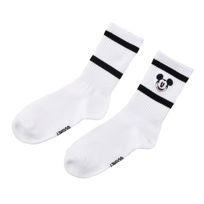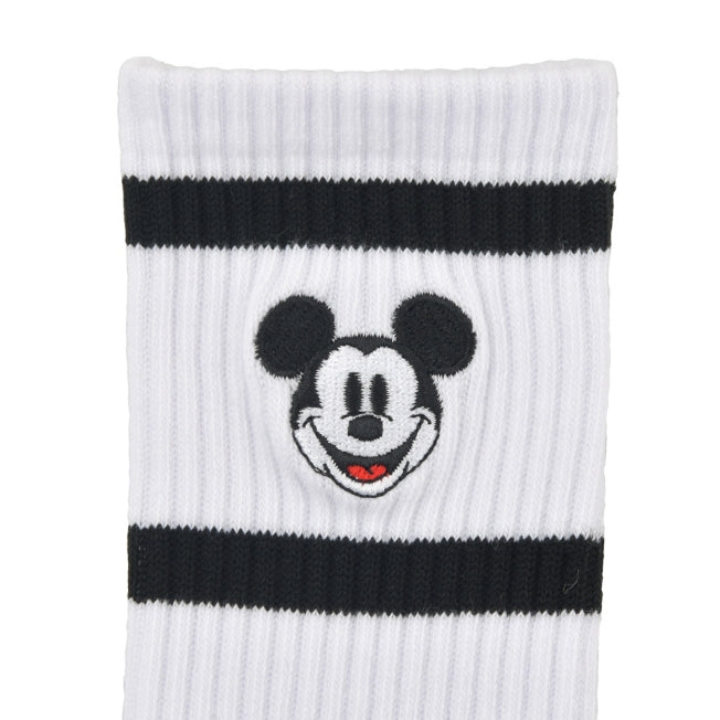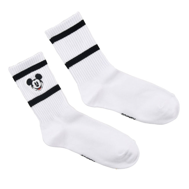 Weiße Socken mit gesticktem Mickey. Traditionelle gestreifte Rippsocken. Das gestickte Charaktergesicht verleiht dem Disney-typischen Spielgeist. Die sauberen weißen Socken sind äußerst praktisch. Da es leicht ist, modische Artikel zu kombinieren, können Sie auch mit Ihrer Familie und Freunden das gleiche tragen!