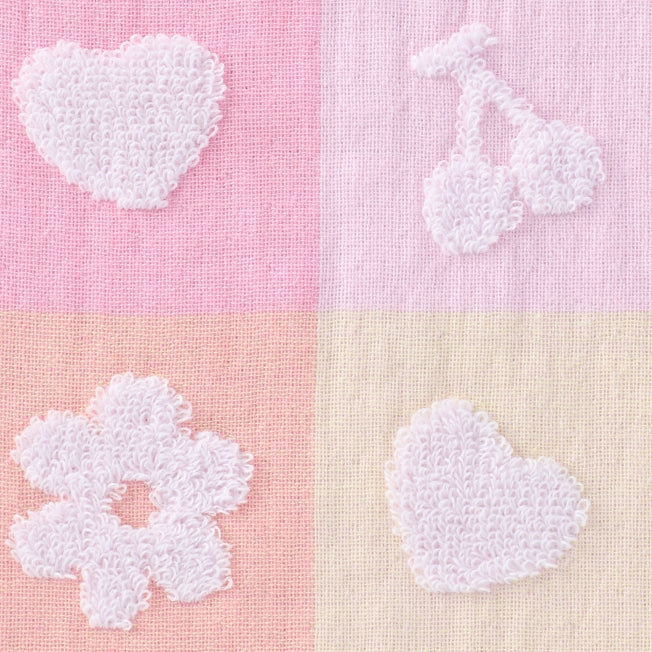 Ein Handtuch mit einem fröhlichen Karomuster und niedlichen Motiven, hergestellt aus leichtem und weichem einseitigem Gaze. Mit antibakterieller und geruchshemmender Behandlung und Namensschild (mit Anti-Flecken-Behandlung).