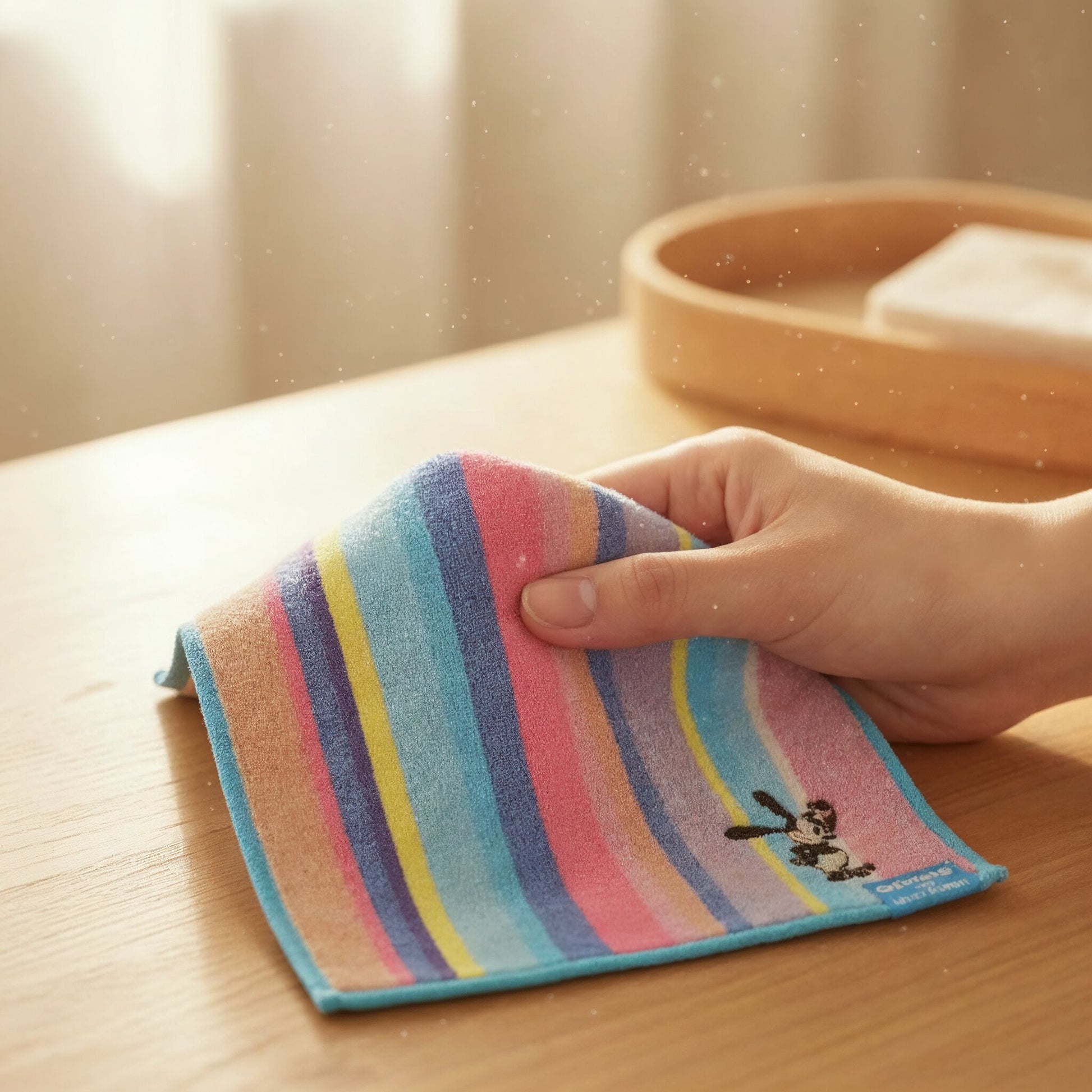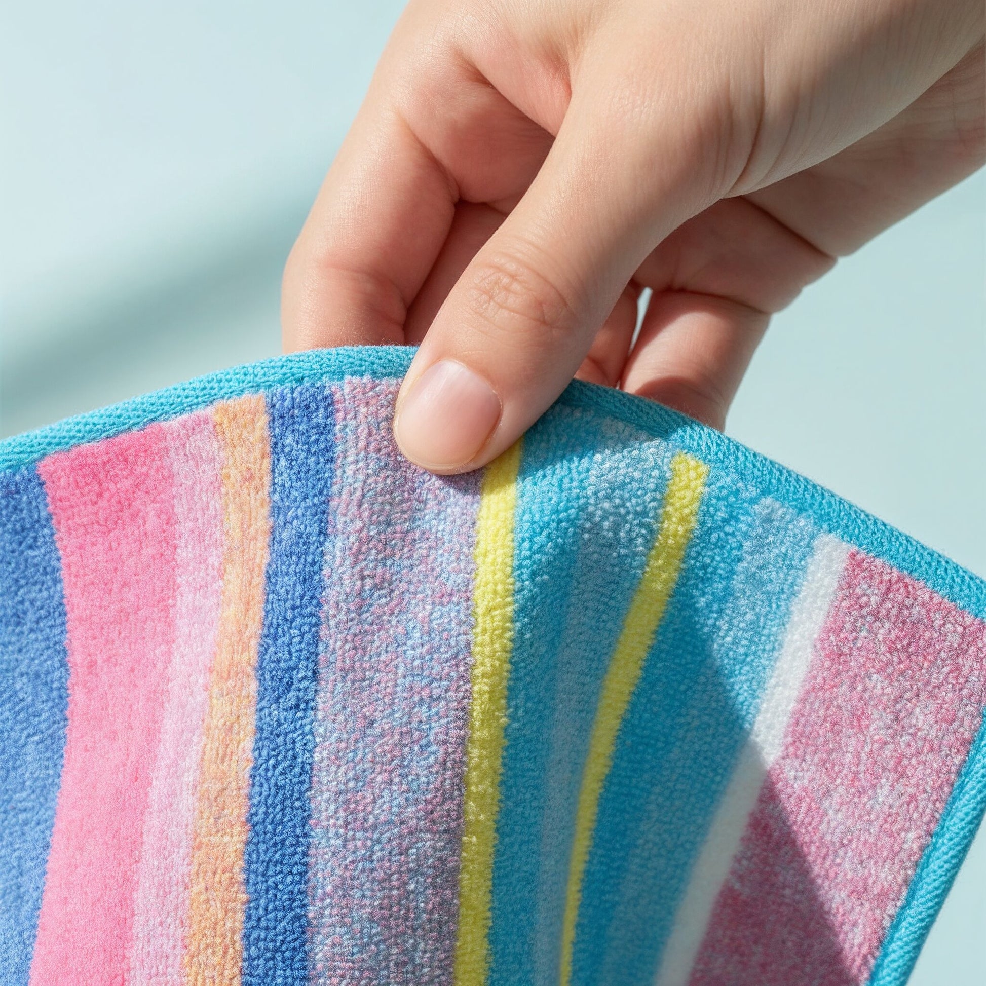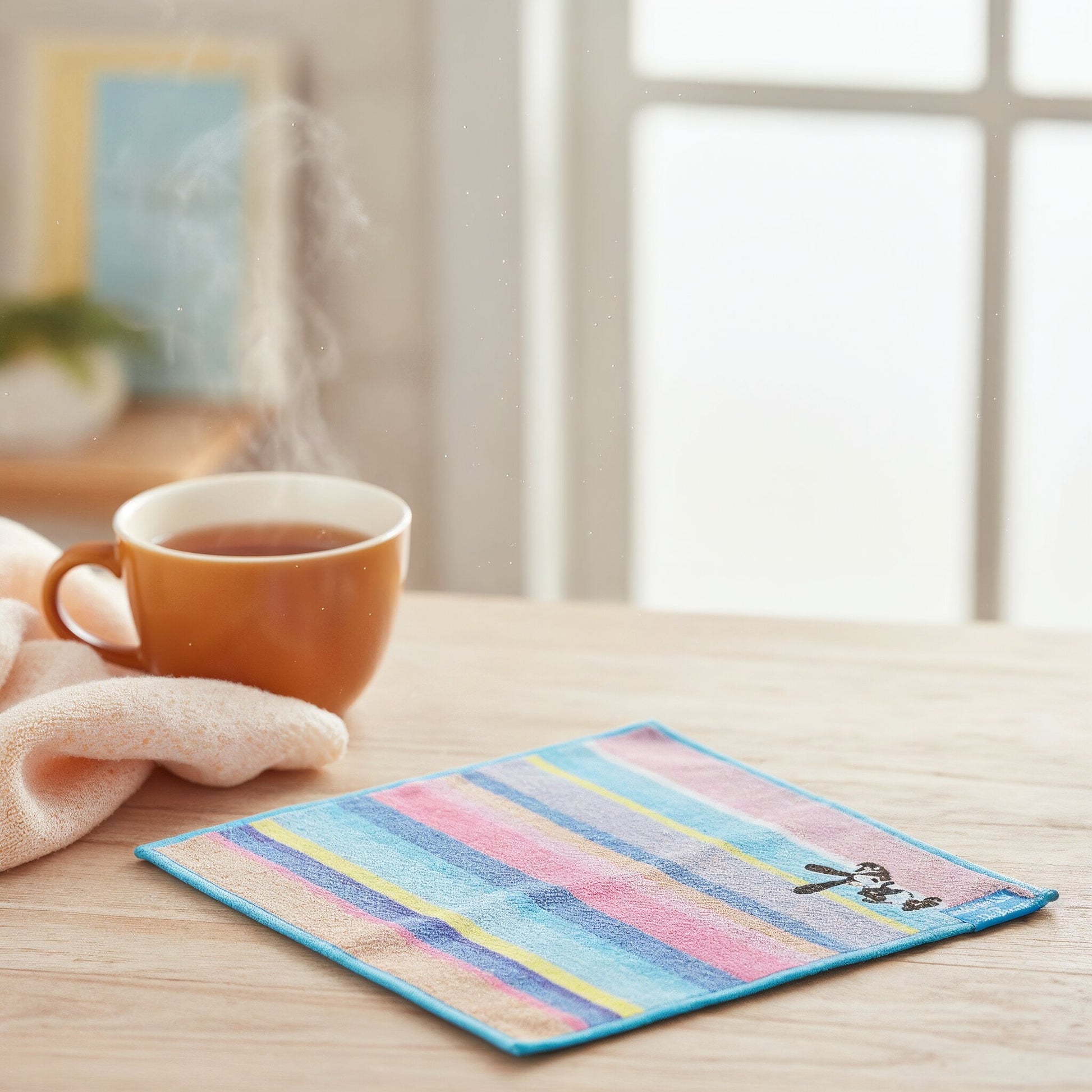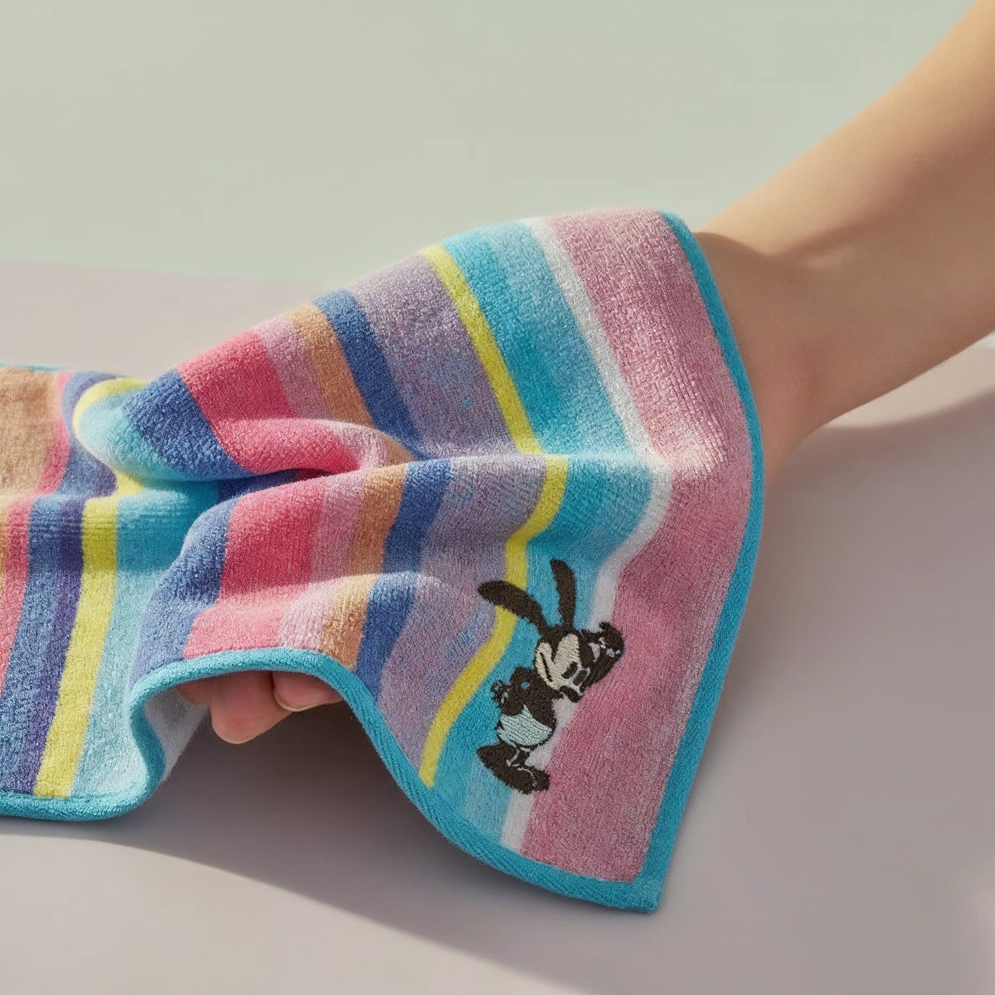 Dies ist ein handliches Handtuch mit einem lebendigen Charakter, der auf einem farbenfrohen Streifenhandtuch mit Melangegarn gestickt ist. Es ist mit antibakterieller und geruchshemmender Behandlung versehen, um unangenehme Gerüche zu verhindern und das Wachstum von Bakterien auf den Fasern zu hemmen. Es ist sicher für Kinder. Die Melangegarn besteht aus zwei verschiedenen Farben, die miteinander verdreht sind, um eine tiefere Farbgebung zu ermöglichen.