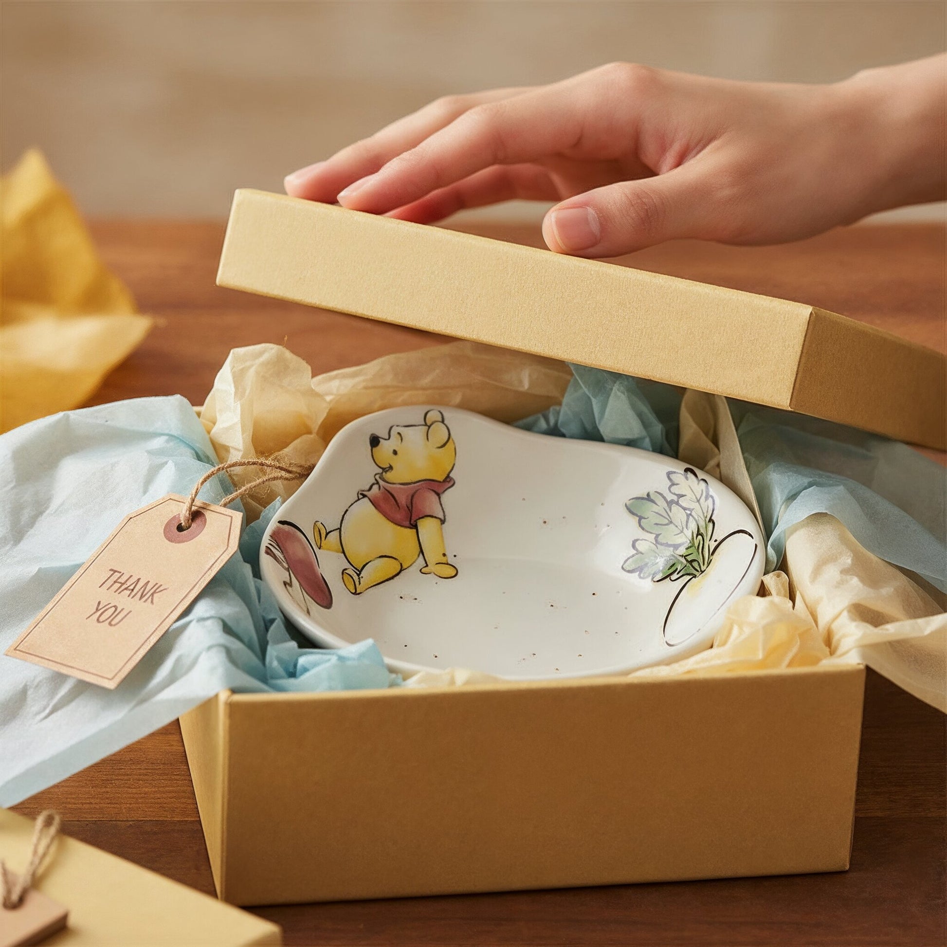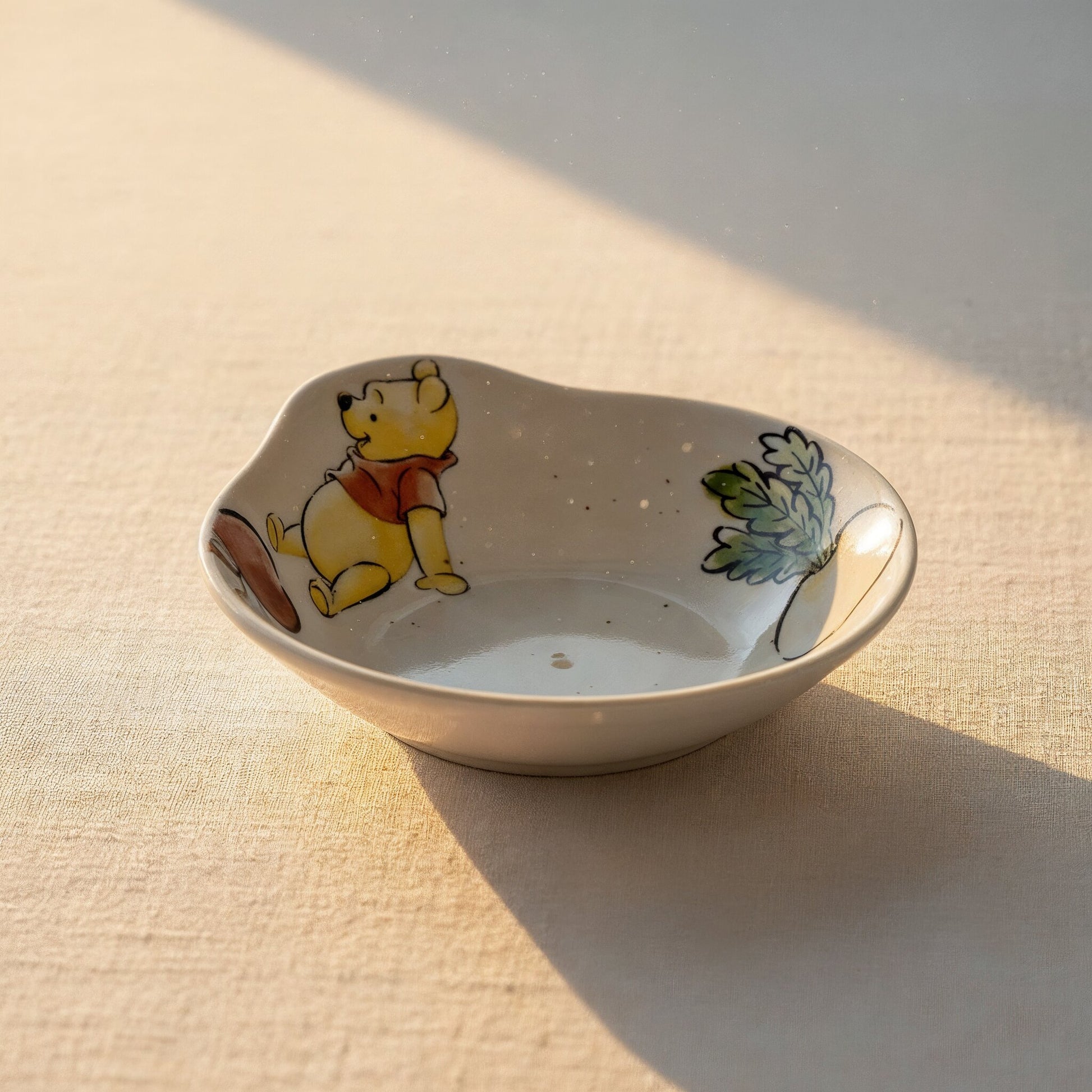 Disney-Geschirr für den Esstisch. Winnie the Pooh Reisschale. Charaktere, die mit einem Aquarell-Touch gezeichnet wurden, vermitteln eine "japanische" Atmosphäre, sowie Designs, die von japanischen Lebensmitteln inspiriert sind. Die niedlichen Charaktere und lecker aussehenden Speisen passen perfekt zusammen. Das beruhigende Design sorgt für eine gemütliche Stimmung, die das Herz erwärmt, nur durch das Anschauen. Die Schale eignet sich nicht nur als Unterteller für Töpfe, sondern auch als kleine Schale. Die handliche Größe macht sie leicht zu halten, und die glatte Porzellanstruktur ist auch attraktiv. Da sie in einer Schachtel mit dem gleichen Muster wie die Reisschale verpackt ist, eignet sie sich auch hervorragend als Geschenk.