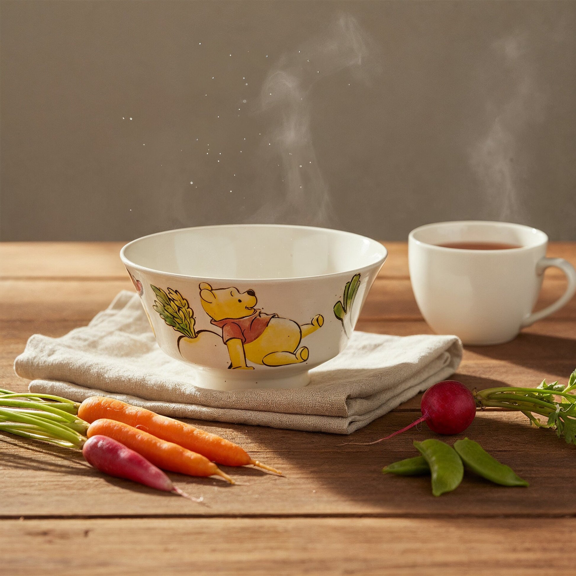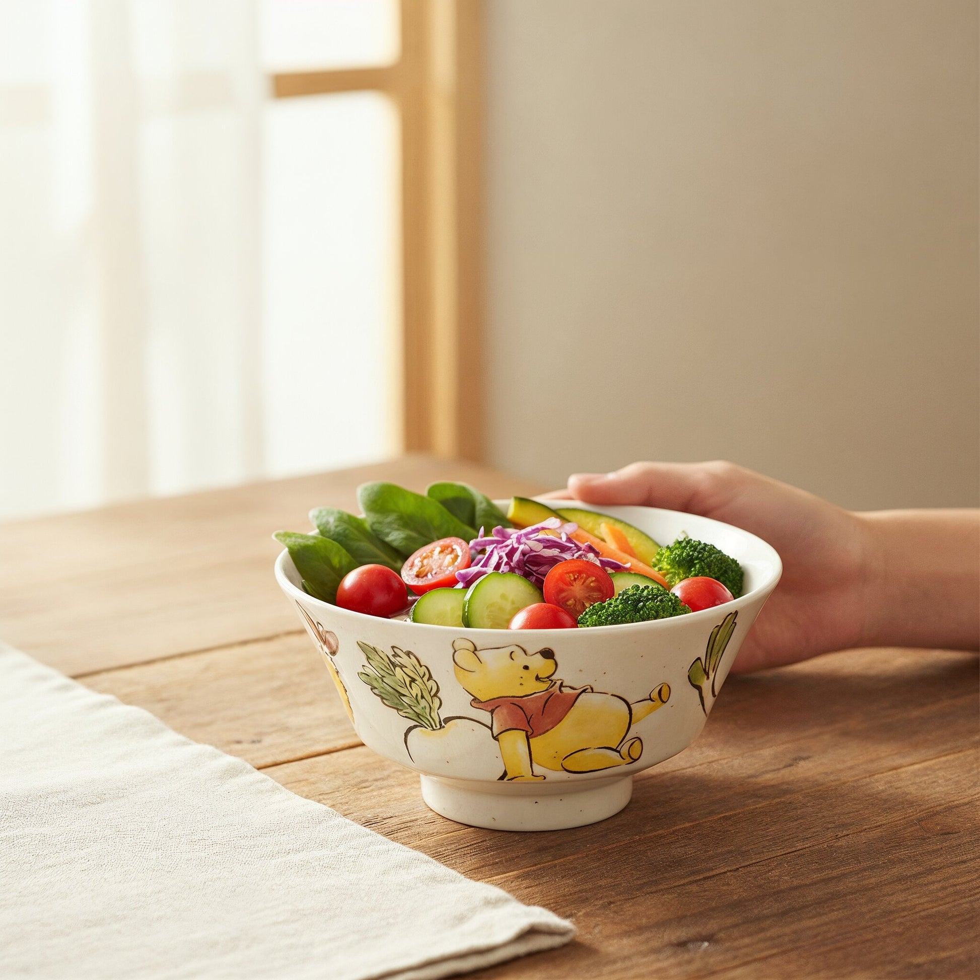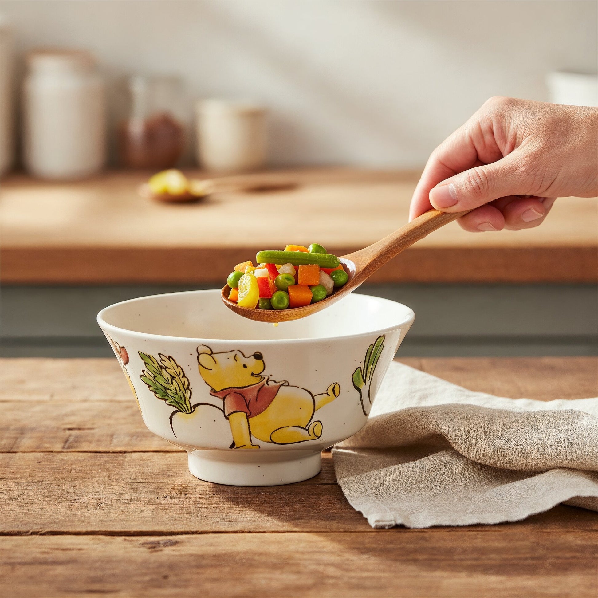 Disney-Geschirr für den Esstisch. Ein Winnie the Pooh Reisschüssel. Winnie the Pooh, der mit einem Aquarell-Touch im "Wa"-Stil gemalt ist, mit Motiven von Zutaten und Gerichten der japanischen Küche wie Rüben, Kastanien und Tempura. Die niedlichen Charaktere und das lecker aussehende Essen passen perfekt zusammen. Das entspannende Design sorgt für eine gemütliche Stimmung. Perfekt für Reisgerichte, Nudelgerichte und andere Gerichte mit Sauce. Der glatte Porzellanstoff ist auch attraktiv. Es wird in einer Schachtel mit dem gleichen Muster wie die Schüssel geliefert und ist daher auch als Geschenk zu empfehlen.