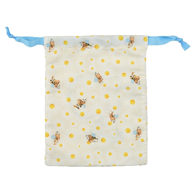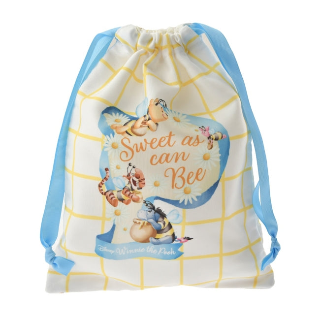 Winnie the Pooh, der Honig liebt, entwirft einen Traum von Honig. Hier ist ein Beutel. Die Charaktere werden zu Bienen und sammeln Honig mit einem Honigtopf. Ein sehr süßes Design. Es ist ein helles und fröhliches Accessoire, das Sie gerne mitnehmen, mit gelbem Karomuster und weißen Blumenmotiven. Es ist eine praktische Größe, nicht zu klein. Ideal zum Organisieren und Verstauen von Gepäck für Picknicks oder Themenparks.