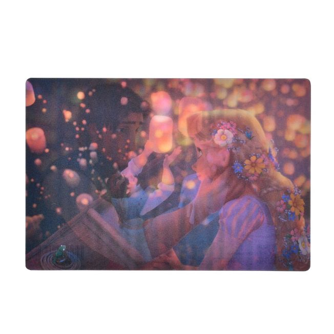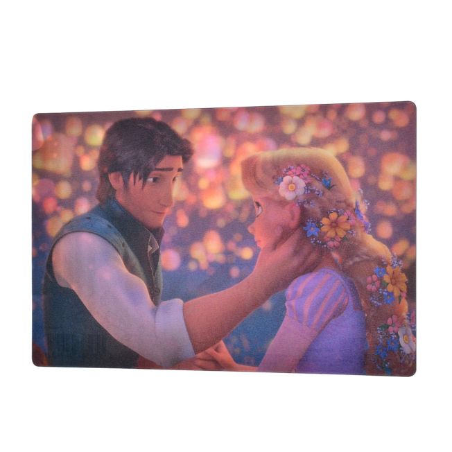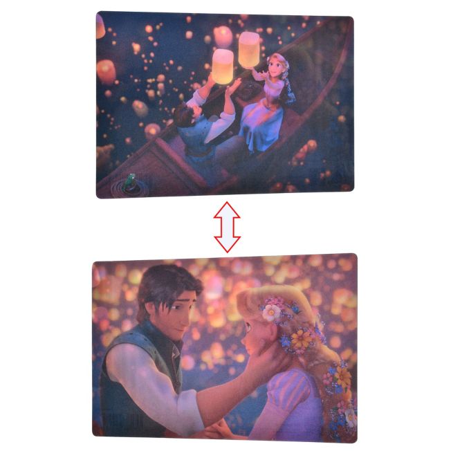 Postkarte mit einem linsenförmigen Effekt, der je nach Blickwinkel anders aussieht. Ein romantisches Design von Flynn Rider und Rapunzel aus "Rapunzel - Neu verföhnt". Neigt man die Postkarte nach links oder rechts, ändert sich das Bild. Auch das niedliche Chamäleon Pascal ist zu beachten. Das Motiv auf der Adressseite ist ebenfalls im Stil des Films gestaltet. Da es aus Papier besteht, kann man mit einem beliebigen Stift eine Nachricht hinzufügen.