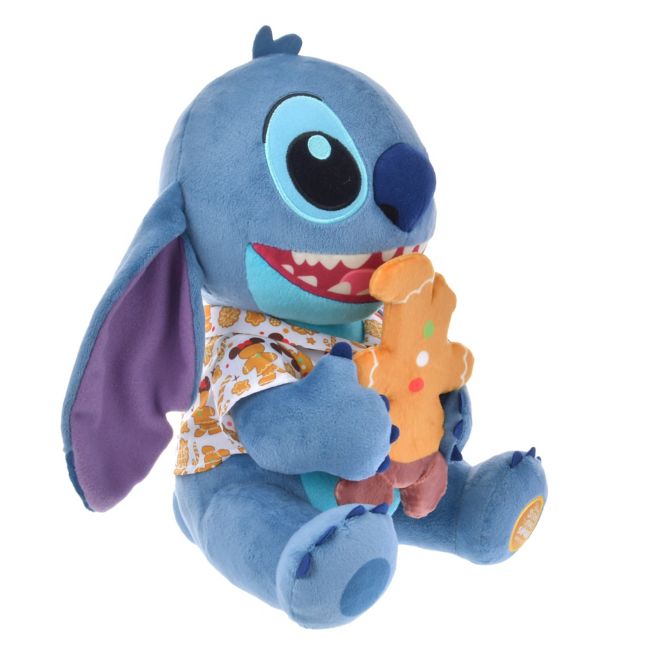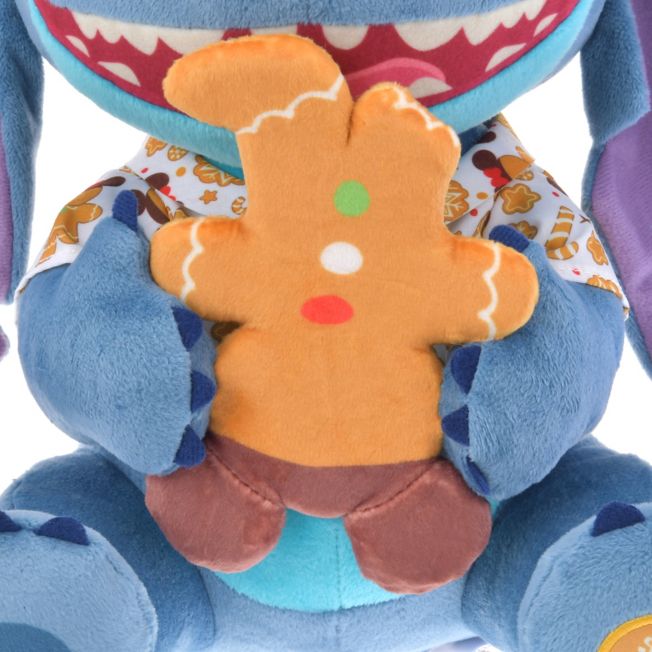 Plüschfigur von Stitch, die dem Motiv von Ingwerbrotkeksen nachempfunden ist. Stitch ist gut gelaunt und hält seinen geliebten Ingwerbrotkeks in der Hand. Der von Stitch angebissene Ingwerbrotkeks hat ein Mickey-Design mit Ohren. Er trägt ein Shirt mit dem Aufdruck von Mickey- und Minnie-Motiven von Ingwerbrotkeksen und die Koordination ist perfekt! Beachten Sie auch das Logo auf der Fußsohle. Ein wunderbares Produkt, das Sie nirgendwo anders finden werden. Bitte beachten Sie: