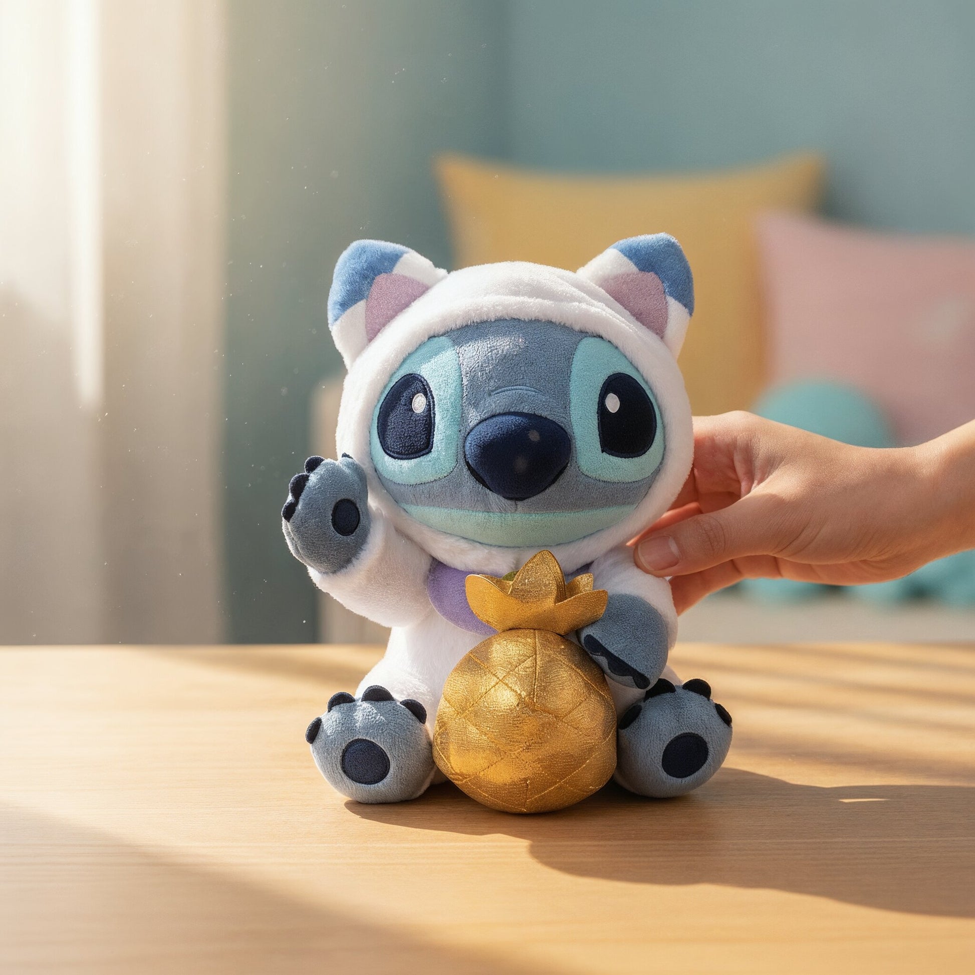 Begrüßen Sie das neue Jahr im japanischen Katzenstil. Stitch Plüschtier. Stitch in einem japanischen Katzenkostüm ist entzückend und frisch. Er trägt eine angenehm klingende Glocke um den Hals und seine erhobene Handgeste sieht aus wie ein Gruß. Seine niedlichen Pfoten sind sichtbar und er hält ein goldenes Ananas-Motiv in der anderen Hand. Die Kapuze des Katzenkostüms kann abgenommen werden. Dekorieren Sie Ihr Lieblingszimmer wie den Eingangsbereich oder das Wohnzimmer und genießen Sie es. Auch als Geschenk geeignet.