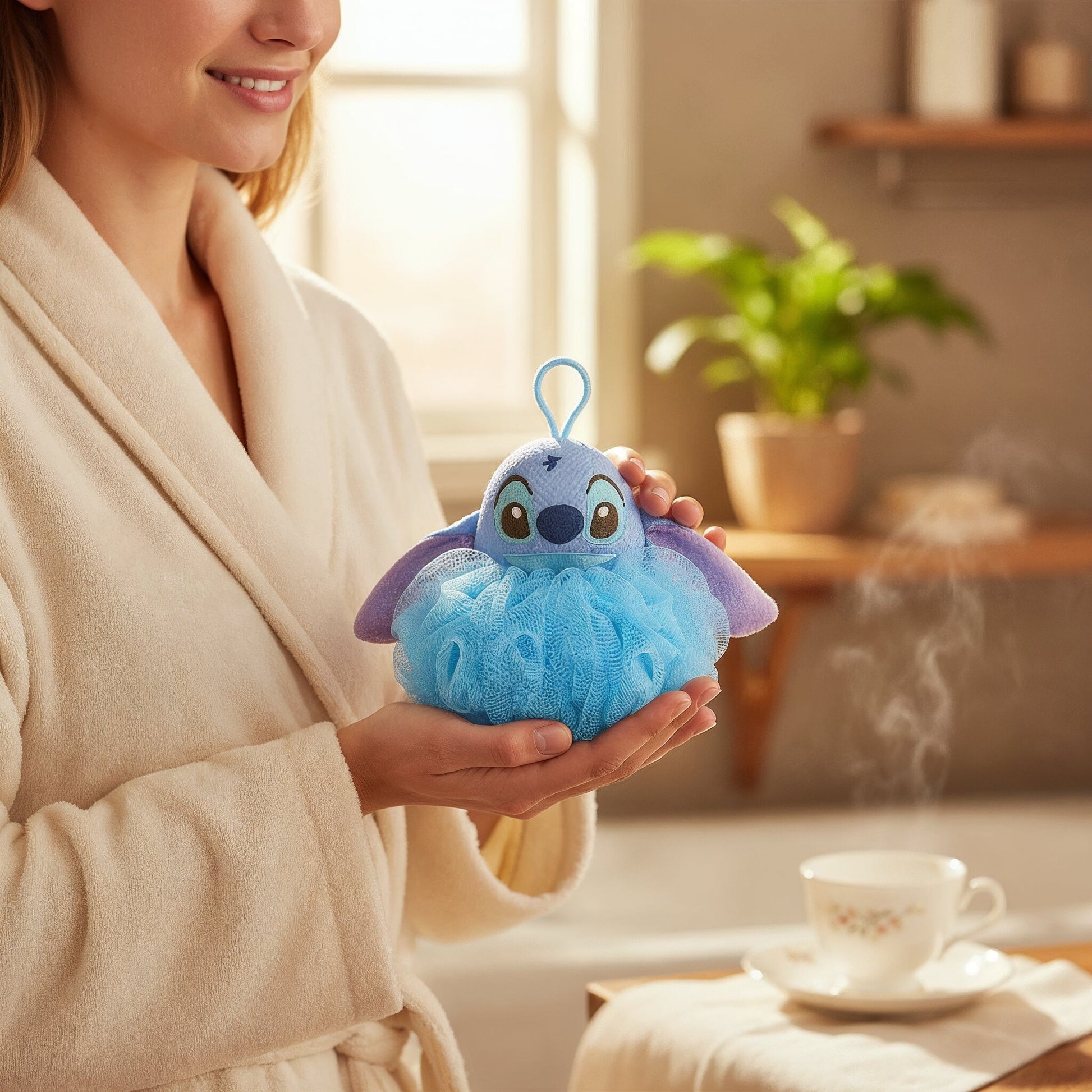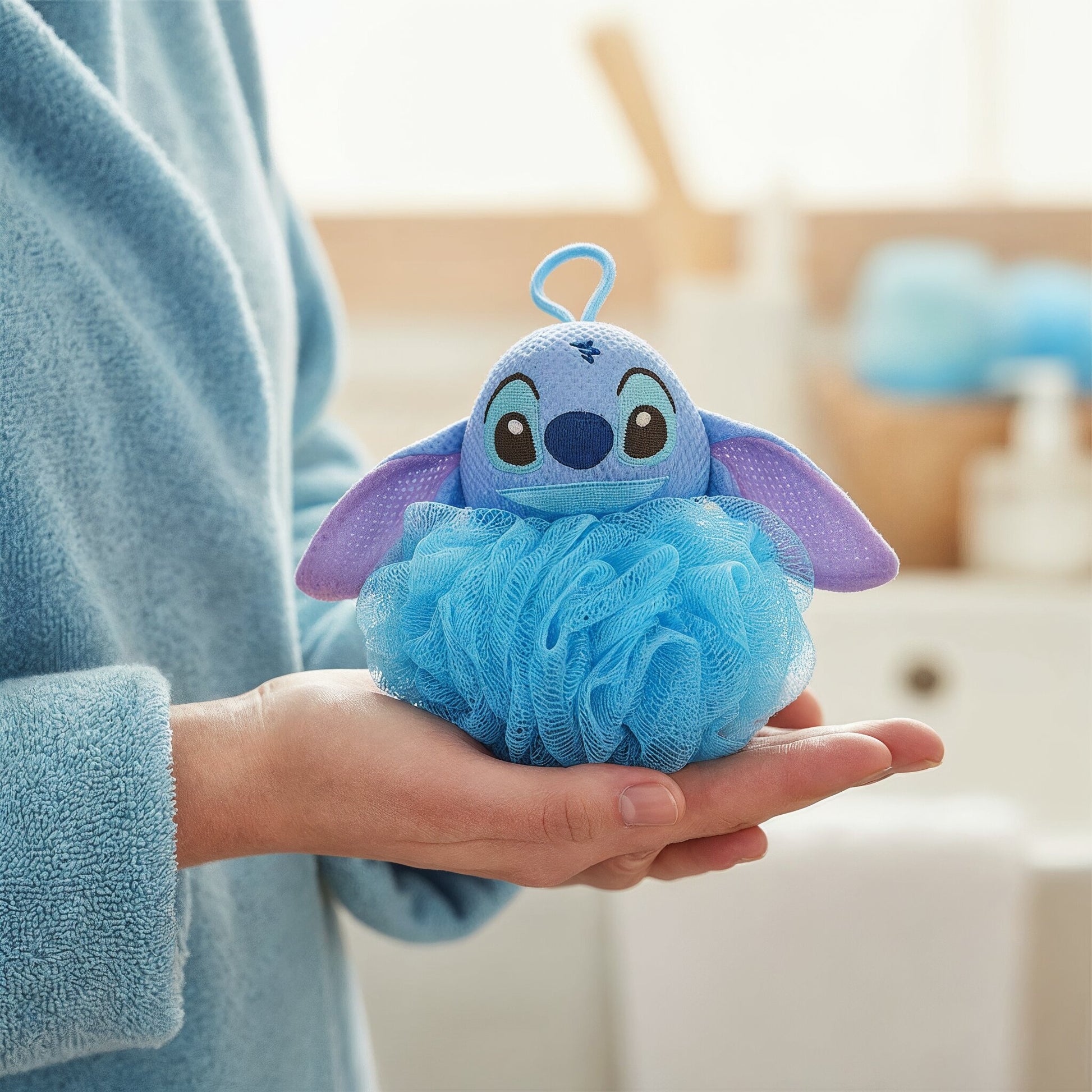Niedliches Badeartikel. Hier ist der Badeschwamm für Stitches Körper. Ein einzigartiges und süßes Design, das einen Netzschwamm in Kugelform und einen Schwamm in Form des Charaktergesichts kombiniert. Die Badezeit wird sicherlich Spaß machen! Es passt gut in die Handfläche und ist einfach zu bedienen. Wenn Sie es gut nass machen und dann Ihre Lieblingskörperseife darauf auftragen, schäumt es gut auf und Sie können Ihren Körper reichlich reinigen. Es hat auch eine Schlaufe, die beim Abtropfen hilft. Ein wunderbarer Badeartikel, der sich sanft um Ihren müden Geist und Körper kümmert!