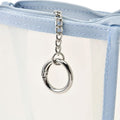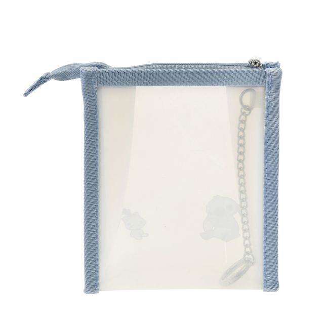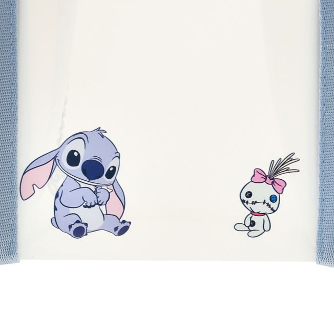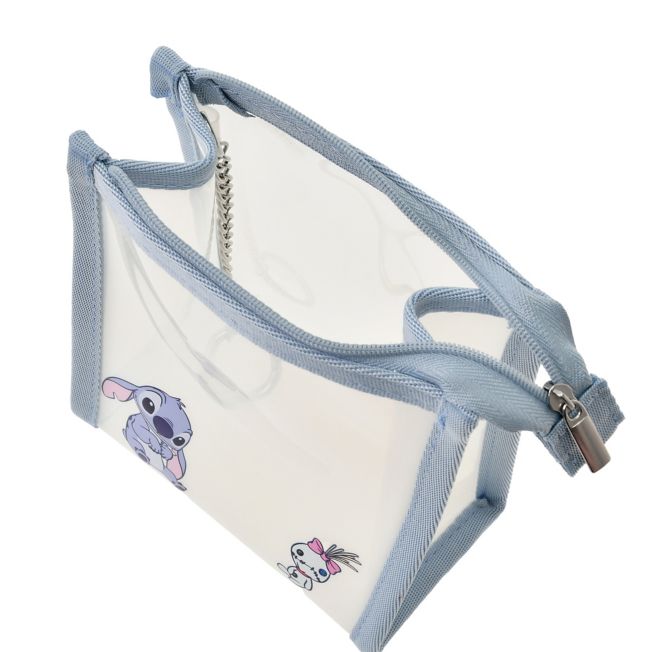 Durchsichtiges Design, um Lieblingsgegenstände von außen sichtbar zu machen. Hier ist eine Tasche mit Stitch & Scrump-Print. Die charakteristische hellblaue Paspelierung verleiht der Tasche einen Akzent. Hergestellt aus milchigem PVC-Material, so dass der Inhalt leicht durchscheint und leicht zu überprüfen ist. Sie können Kosmetikprodukte und Lieblingsaccessoires hineinstecken und süß anpassen. Mit einem Karabinerhaken, der praktisch ist, um sie an Ihrer Handtasche zu befestigen und herumzutragen oder wenn Sie Schlüssel oder Schlüsselanhänger anbringen möchten.