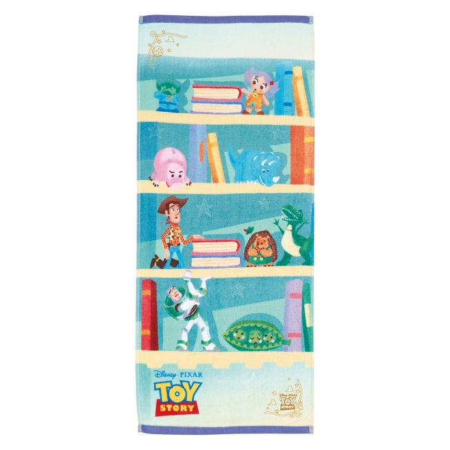 Dies ist ein niedliches Handtuch, auf dem die Charaktere von Toy Story in einem Bücherregal spielen.
