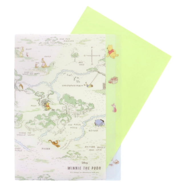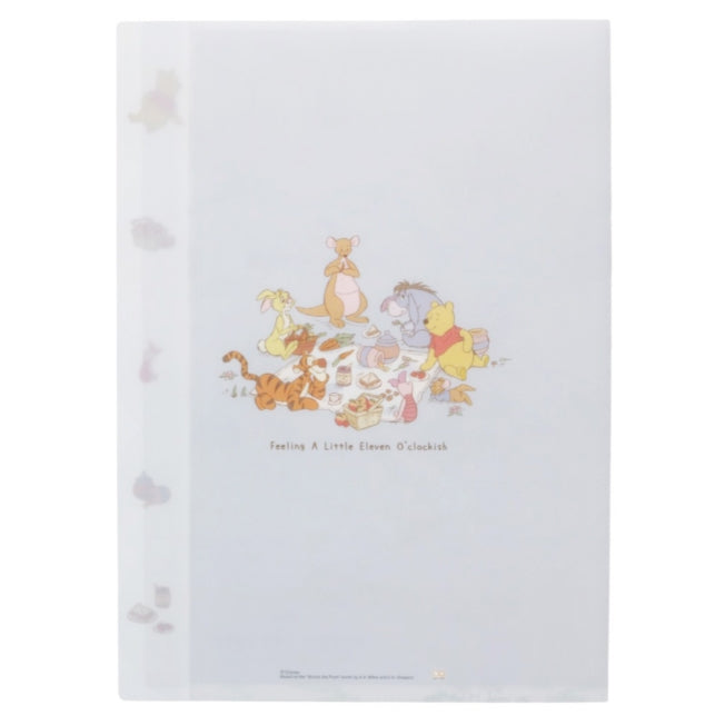 "D-Clear File 5P" mit fünf verschiedenen Indizes, jeweils mit niedlichen Illustrationen. Das Muster zeigt Winnie the Pooh. Die Vorderseite zeigt das Gesamtbild der 100 Acre Woods-Schrift.