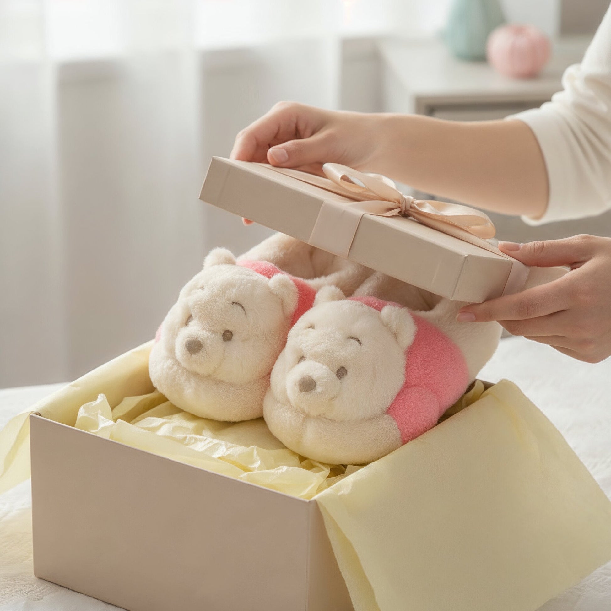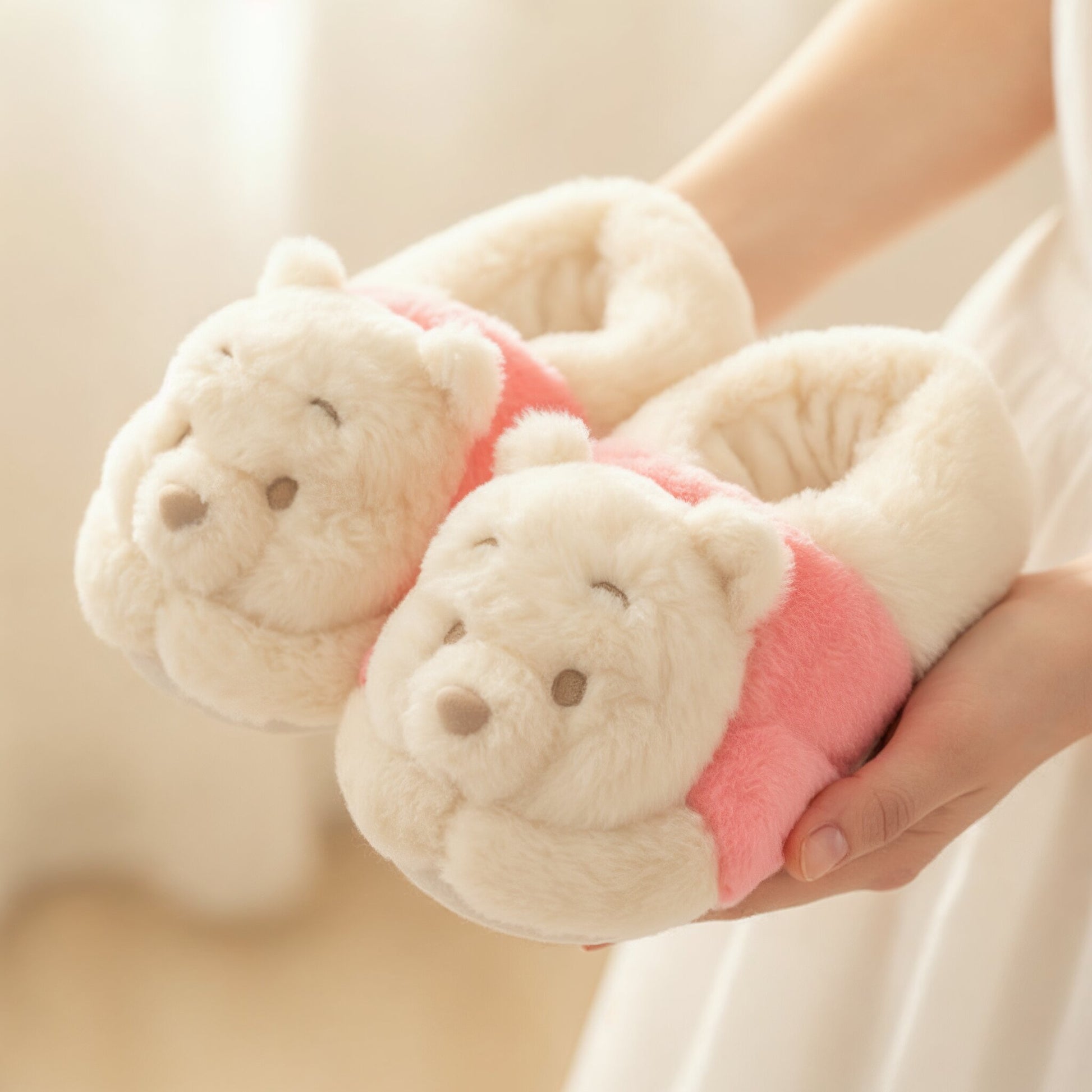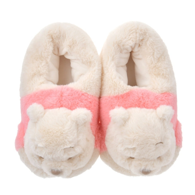 Hausschuhe im Design von Winnie the Pooh. Das niedliche Charakterdesign von Pooh wurde in Hausschuhen nachgebildet. Der Blick von unten nach oben ist entzückend. Winnie the Pooh, dargestellt in sanften Farben und flauschigem Material, sieht nicht nur süß aus, sondern fühlt sich auch weich an. Ein entzückendes Charakterprodukt, das perfekt für entspannte Zeiten zu Hause ist.