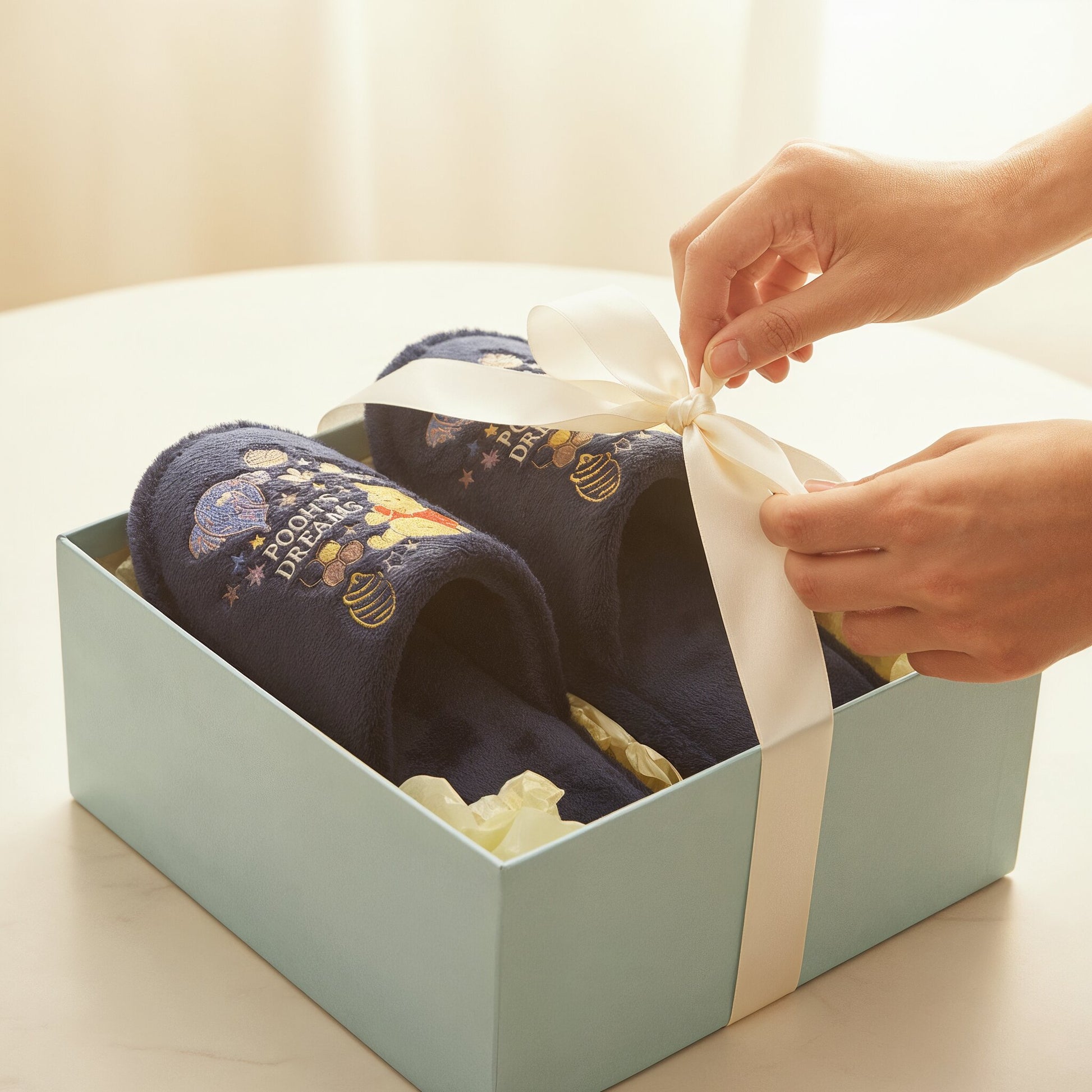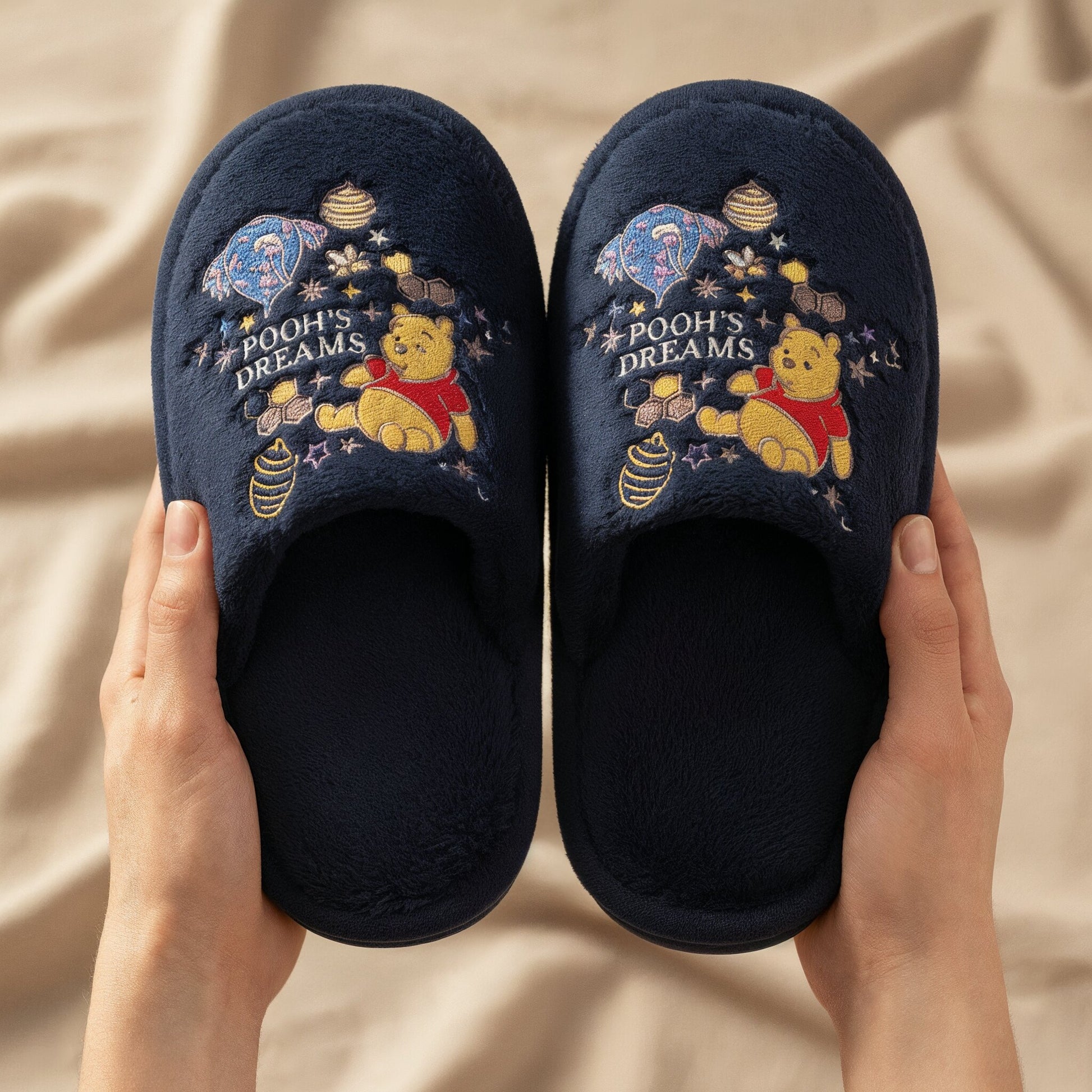 Dies ist ein Paar Hausschuhe, das die Welt von Winnie the Pooh zum Ausdruck bringt. Das marineblaue Design mit Pooh, Tigger, Honigtöpfen und anderen Designs ist sehr beeindruckend. Es fühlt sich flauschig an und ist sehr beruhigend! Es ist ein großartiges Produkt für kühle Tage und auch für die Jahreszeiten, in denen es unter der Klimaanlage kalt wird. Es wird sicherlich ein warmes Gefühl vermitteln, wenn Sie auf Ihre Füße schauen.