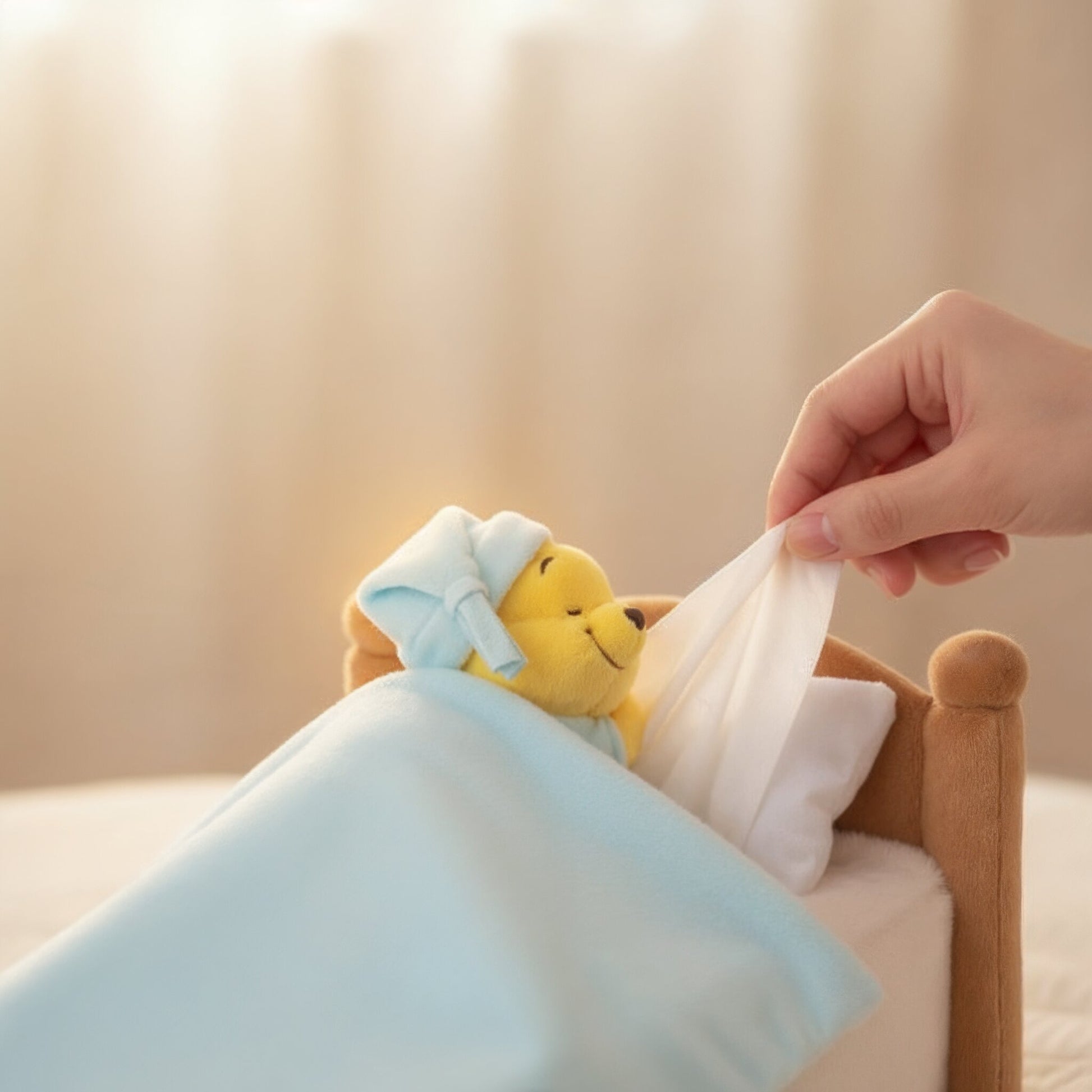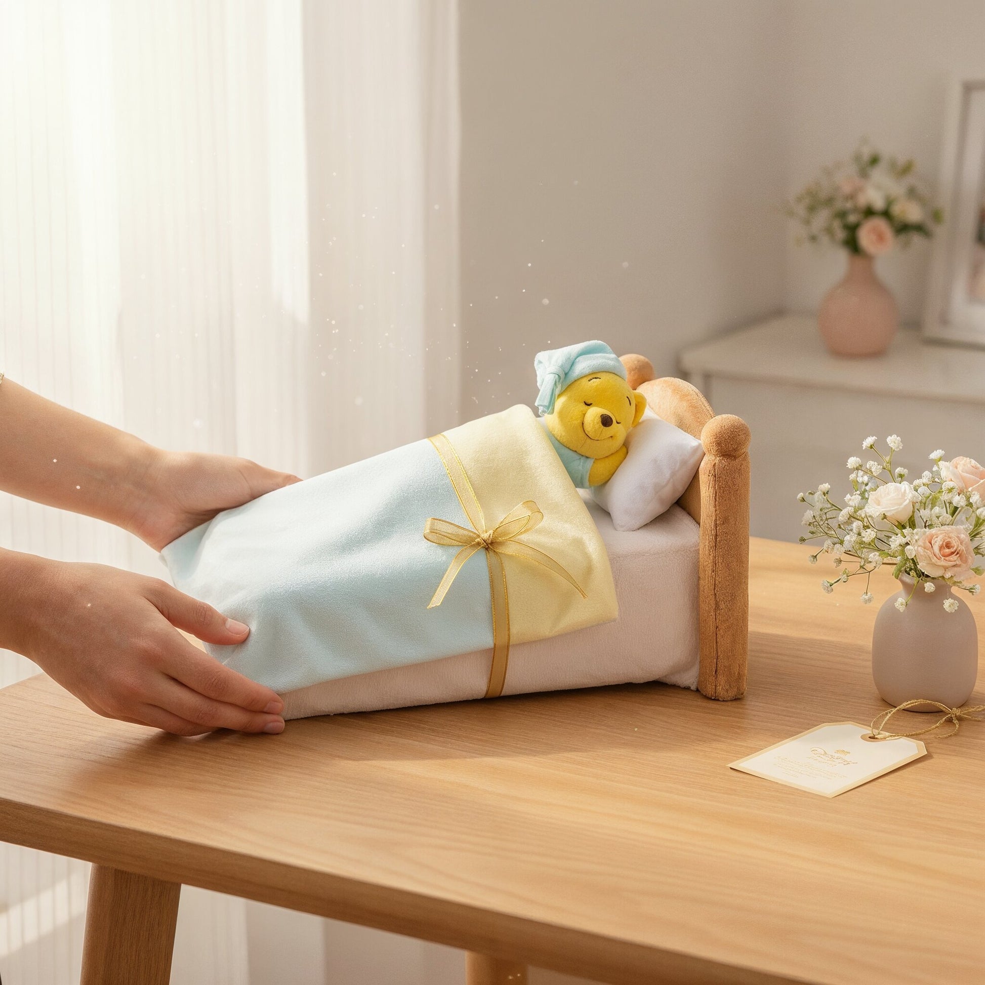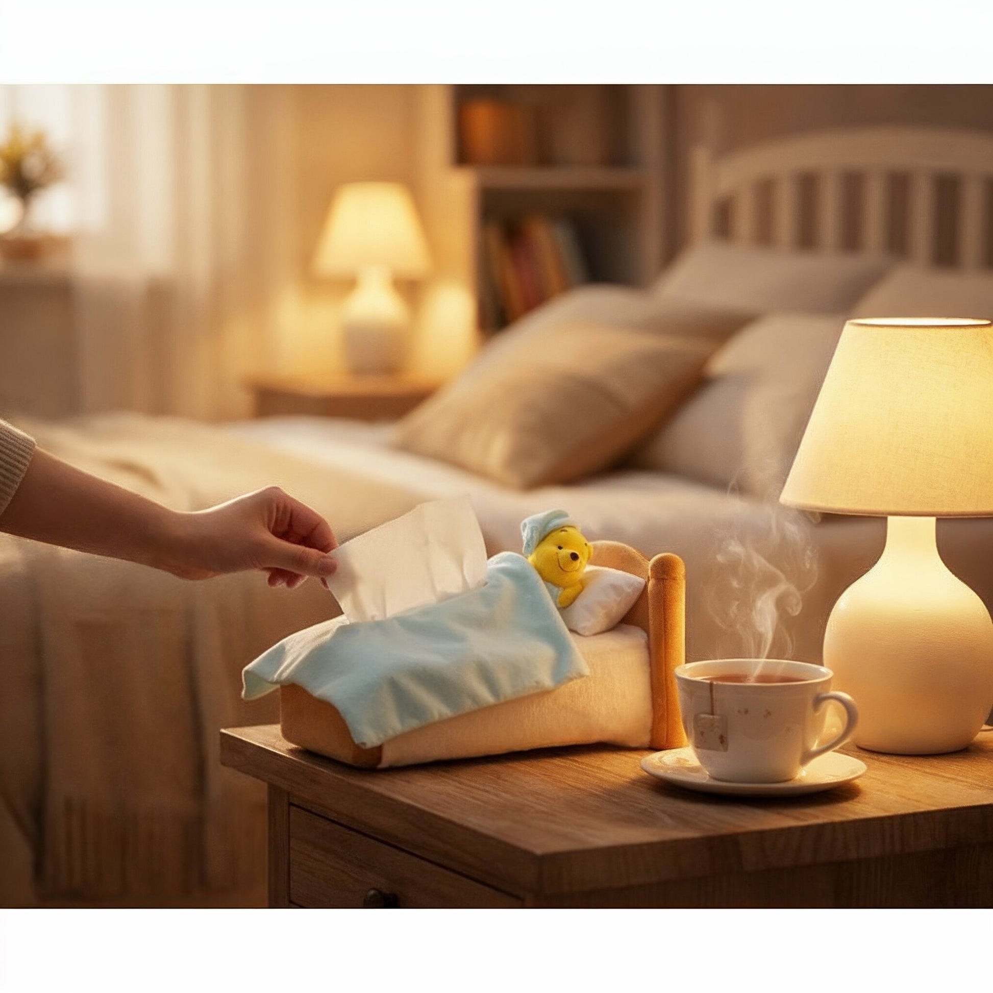 Empfohlen für das Schlafzimmer. Winnie the Pooh Taschentuchbox-Abdeckung. Es reproduziert Winnie the Pooh, der in süßer Nachtwäsche liegt und sich gemütlich fühlt. Es ist sehr süß, wie er auf dem Bauch liegend seinen Arm als Kissen benutzt. Wenn Sie die Bettdecke zurückklappen, gibt es eine Öffnung zum Herausnehmen von Taschentüchern. Ein Interieurartikel mit einem hohen Maß an Entspannung, der Sie einfach nur beim Anschauen glücklich macht.