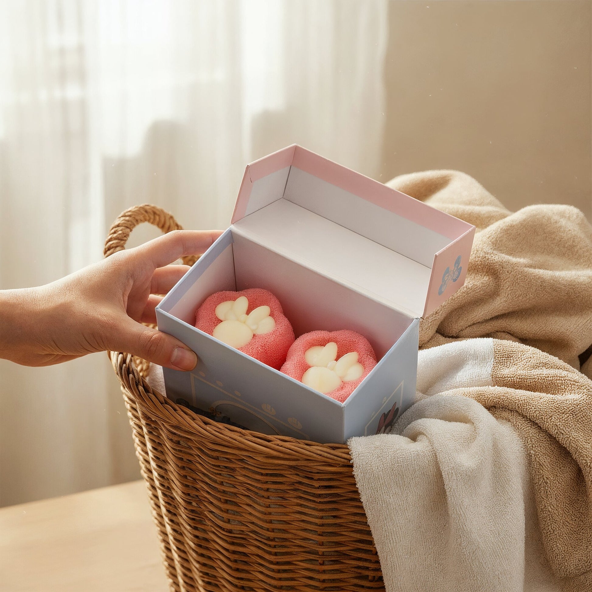 Öffnen Sie sie und entdecken Sie vier Waschbälle mit Minnie-Motiven. Der rosa Schwammteil hat die niedliche Blumenform. Die